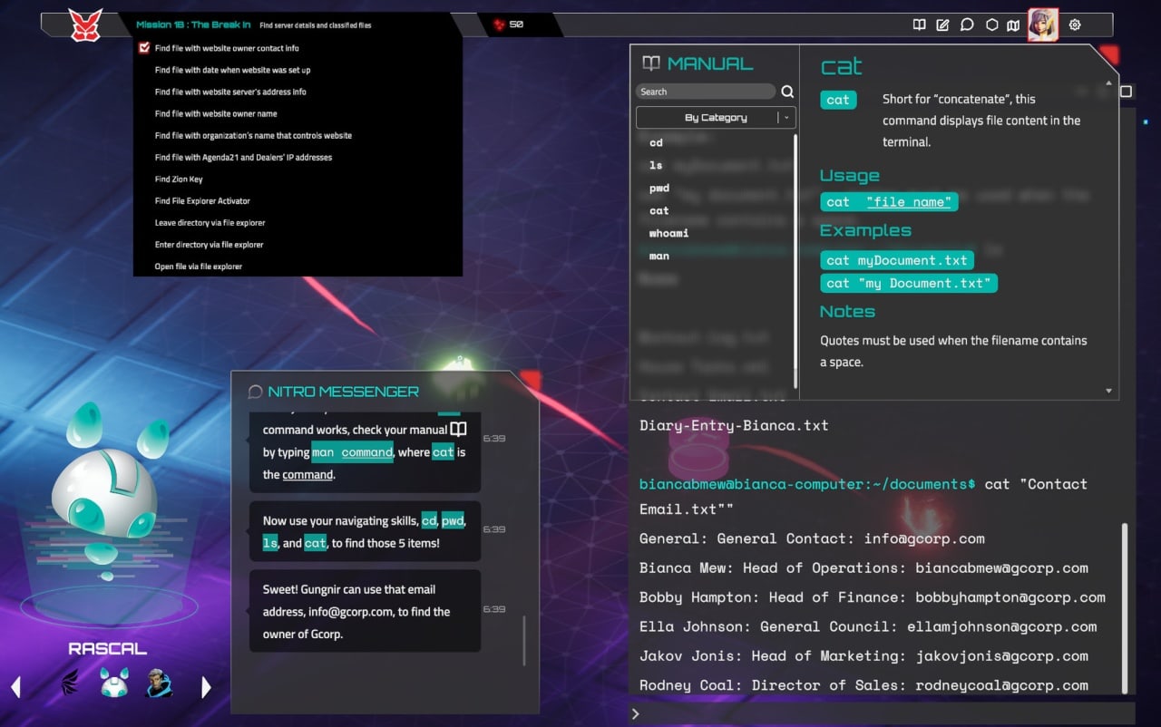 Со слов разработчиков, Мир Хайку призван обучить пользователей основам кибербезопасности. Вдобавок этот продукт способен научить людей пользоваться Линуксом и овладеть разнообразными командами или инструментами. Помимо этого инди-тайтл демонстрирует работу различных киберинструментов из реальной жизни. К примеру, тут можно посмотреть на SSH, Hydra, JohnTheRipper, Ping, Nmap. Сначала здесь юзеров всему учат, и первое время держат за ручку. А затем предоставляют их самим себе, позволяя в рамках видеоигры взламывать сервера, подбирать пароли, копаться в данных и так далее. Кампания поделена на миссии с нарастающей сложностью. Сюжет подается через диалоги. Их можно ускорять.