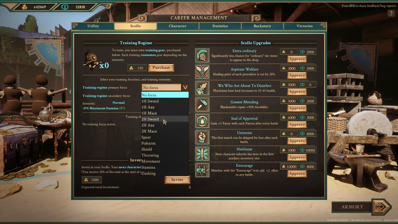 В We Who Are About To Die боевая механика разработана отдельно для каждого стиля гладиаторов и оружия. К примеру, за мурмилона, который бьется при помощи большого щита и короткого меча, можно сочетать защитную и атакующую стойки, нанося удары, когда противник устанет пробивать блок. А вот за димахера, держащего в руках по мечу придется чаще атаковать и ловко уклоняться от ударов, используя скорость и ловкость. Примечателен и тот факт, что смерть является финалом каждого прохождения – после нее придется начинать путь к славе заново.