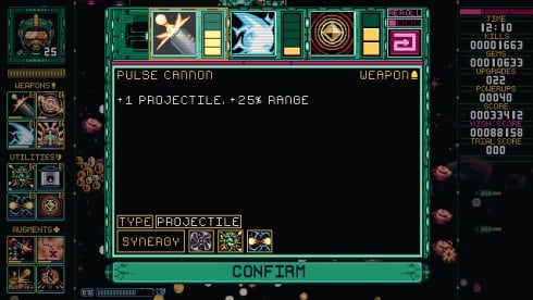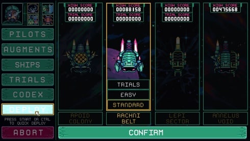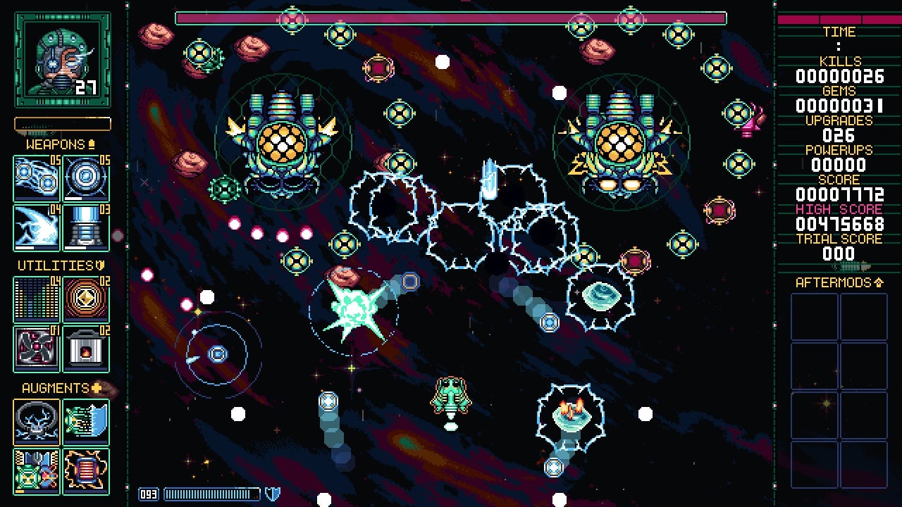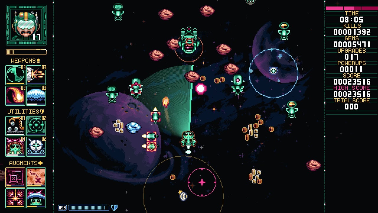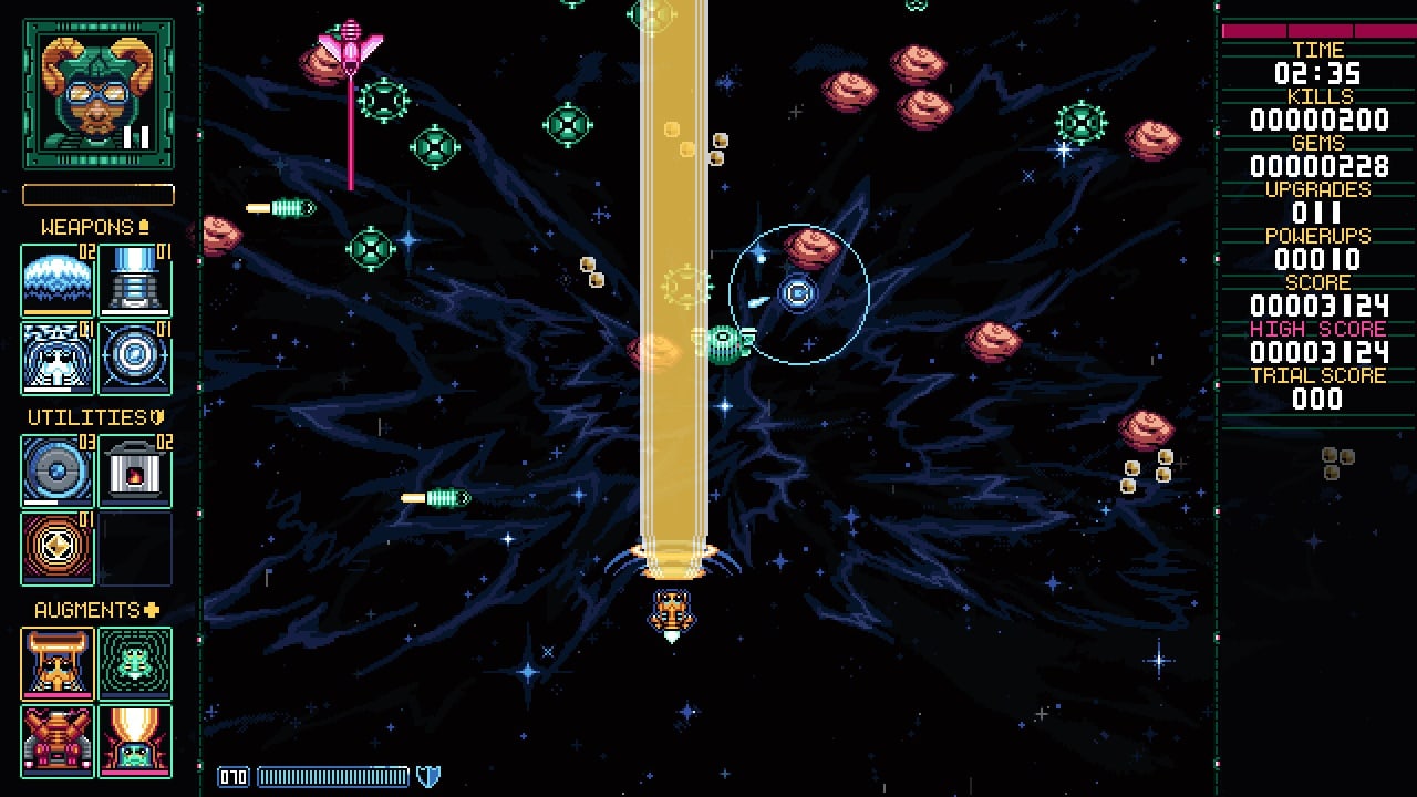 тоже. Игрок наблюдает за происходящим сверху. На выбор геймеру дают 3 пилотов. В этой видеоигре есть 5 типов бонусов, 10 ачивок, 11 разновидностей супостатов (у них есть разные вариации) и 21 вид оружия. Благодаря влиянию рандома каждый следующий забег отличается от предыдущего. Чтобы успешно пройти эту инди-игру, надо достичь трех побед над боссами. По мере прохождения открывается новый контент.