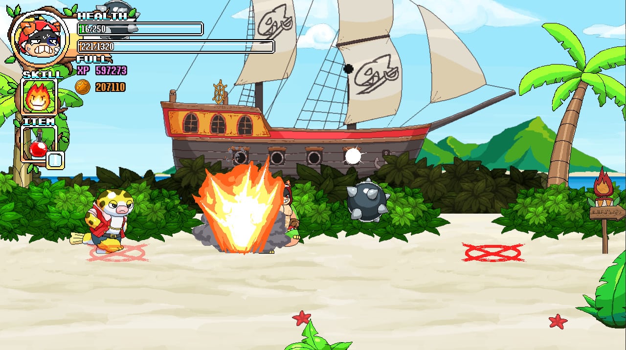 Tribal Hunter – это гибрид экшена и платформера с видом сбоку и элементами метроидвании. Графика в данном проекте выполнена в стиле пиксель-арт. Юзер управляет существом, похожим на смесь человека и ящера, по имени Munch. Так зовется легендарный дух-хранитель. Его призывает племя туземцев, чтобы спастись от вторжения армии лорда Даркреда, состоящей из рыб-пиратов и свиней. Герой может передвигаться влево и вправо, прыгать, болтать с NPC, бить противников кулаками, использовать разные скиллы. Также он способен поедать своих врагов. Пожирание недругов не только заполняет шкалу сытости (это что-то вроде счетчика магии), но и позволяет протагонисту физически расти. Рост дает свои плюсы и минусы. Чем больше воин, тем более мощные атаки он проводит. Однако его соперникам намного легче попадать по нему.