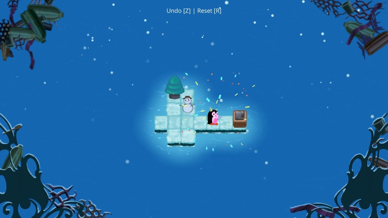 Путь назад – это вариация на тему Сокобана. Здесь тоже надо расставлять предметы особым образом. Пингвинчик должен убрать все пластиковые отходы с карты, чтобы ему засчитали её прохождение. Он может двигаться вверх, вниз, влево, вправо и толкать объекты в соответствующие стороны. Мусор различается между собой формой. Его необходимо сортировать по соответствующим урнам. К примеру, спрессованный в виде треугольника пластик нужно выбросить в треугольный мусорный контейнер, а не квадратный. Встречаются препятствия, вроде снеговиков или ёлок, которые нельзя отодвинуть. Постепенно вводятся новые механики, слегка усложняющие геймплей. Например: тонкие льдины, способные треснуть, если на них стать или что-нибудь оттуда убрать.
