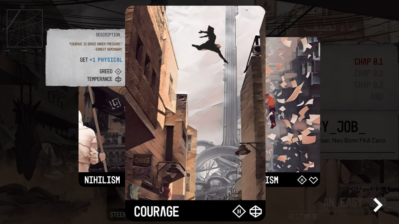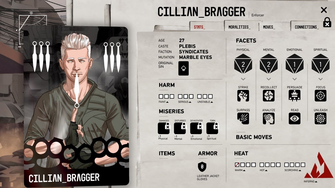У DR двухмерная рисованная графика, напоминающая интерактивный комикс. Сам проект можно назвать смесью визуальной новеллы и ролевой игры. Несмотря на отсутствие редактора персонажа, юзер может сформировать образ выданного ему подопечного. Геймер получает 42 карточки характера, с помощью которых он создает личность киллера. Наёмник может пройти путь к 7 смертным грехам или к такому же числу добродетелей. Можно выстраивать различные отношения с NPC. Игроку часто необходимо делать выбор, что влияет на ход повествования. Он при этом не просто выбирает действие или реплику, но и бросает кости. От этих кубиков зависит результат и его последствия. Также здесь есть драки. Бои проходят в пошаговом режиме. В них надо выбирать типы ударов и тоже бросать дайсы. А ещё тут необходимо постоянно следить за температурой, чтобы не перегреться на жаре.