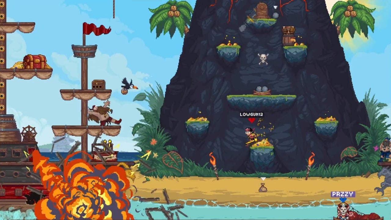 Plunder Panic может понравиться любителям пати-игр и проектов на пиратскую тематику. Это двухмерный и пиксельный экшен-платформер с видом сбоку. В него можно играть компанией за одним компьютером или по сети. Матчи рассчитаны на 12 человек максимум. Одиночный режим тоже присутствует. Упор в геймплее сделан на сражения между геймерами и командное взаимодействие. По сюжету 2 экипажа корсаров ведут борьбу за господство в открытом море. Победить в сражениях можно несколькими способами: убить вражеского капитана определенное число раз, вернуть достаточное количество золота, потопить корабль соперников, выстрелив в него из расположенной в центре карты пушки или протаранив его начиненной динамитом лодкой.