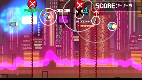 Waveform Wipeout сочетает в себе ритм-игру, раннер и платфомер. Двухмерная графика проекта выполнена в стиле пиксель-арт. Камера расположена сбоку. Тайтл использует киберпанковский сеттинг, вдохновлённый фильмами 80-х. В этой видеоигре надо кататься на футуристическом скейте по звуковым волнам. Персонаж двигается сам слева направо. Юзер может его немного перемещать в пределах экрана, прыгать, скользить и выполнять различные трюки. Задача пользователя: уклоняться от препятствий, собирать бонусы, исполнять финты и увеличивать комбо-множитель, чтобы заработать максимальное количество очков и получить хороший результат.