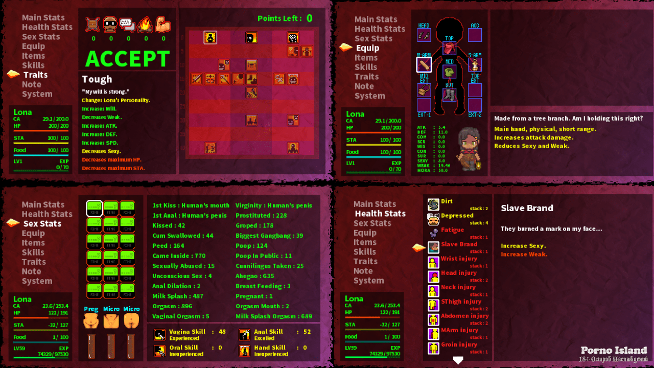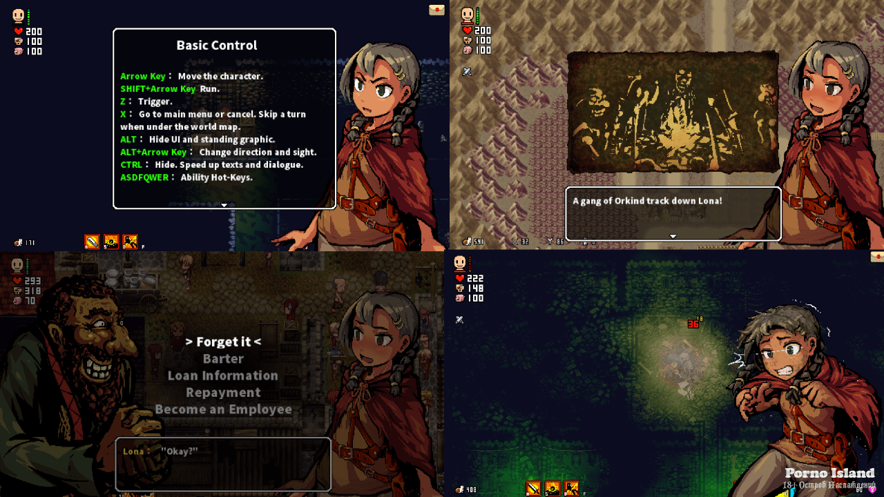 LONARPG RUS v B.0.10.7.0 Новая версия Полная версия Последняя в альт. раздачах Дата выхода 2021 Разработчик eccma417 Жанр Приключения, RPG Обновлено 28 мая 2025, 01:15 Список изменений LONARPG – это сложная ролевая игра, в которой придется пережить сотни сложных сражений. Поэтому важной составляющей приключения станет накопление опыта и прокачка своих способностей. В сюжете речь пойдет о девушке по имени Лона, которой пришлось покинуть свой родной город из-за нападения страшных жуков. Прибыв в новое безопасное поселение главная героиня присоединяется к гильдии авантюристов, чтобы научиться сражаться и дать бой монстрам. РПГ выполнено в олдскульной двухмерной графике с видом сверху и мрачным антуражем.В LONARPG у Лоны есть следующие параметры и характеристики: Здоровье – если оно иссякнет, девушка погибает. Энергия – по ходу игры героиня устает. Если этот показатель станет -100, то она заснет. Еда – можно восстанавливать здоровье во сне, однако для этого авантюристка должна быть сыта. Внешность – от этого будет зависеть отношение персонажей. Настроение – будет отражаться в эмоциях и страданиях. Очки обмена – накапливаются для покупки товаров, но после сна сбрасываются. Грузоподъемность – в перегруженном состоянии девочка не сможет передвигаться. Есть в игре необычные для данного жанра аспекты. К примеру, здесь можно изучать навык Проституция. Получив его и прокачав протагонистка сможет совершать оплату разных услуг и предметов с помощью секса. Помимо этого, присутствует такое понятие как Сексуальный бой, который может случиться, если враг использует захват. Игрок должен попытаться освободиться используя клавиши. В игре придется путешествовать по большому миру с подземельями и лесами. Есть ближний и дальний бой, а также возможность подкрадываться к противникам скрытно. Скачать торрент Скриншоты Видео из игры Скачать LONARPG Тип релиза Лицензия (Таблетка: Не требуется) Версия v 0.10.7.0 Размер 806.03 МБ Интерфейс Русский Озвучка Отсутствует Установка: Примечание Более актуальная версия: v B.0.10.7.0находится в блоке - Альтернативные раздачи. Скачать .torrent торрент файл Скачать БЕЗ торрента прямая ссылка через uTorria Альтернативные раздачи Прямые ссылки Облачные хранилища v B.0.10.7.0 670.5 МБ Показать Системные требования ОС: 7 / 8 / 10 Процессор: 2 GHz - Dual Core Оперативная память: 2 ГБ Видеокарта: 2 ГБ Пиксельная графика, Нагота