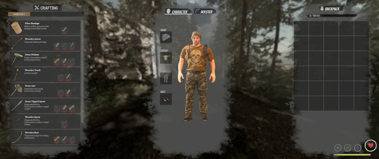Это трехмерный симулятор выживания в открытом мире с видом от первого лица. В нём по традиции есть смена дня и ночи. Инди-проект создан всего парой человек. Здесь можно исследовать локации, рубить деревья, собирать грибы и другие растения. Присутствует крафт инструментов и вооружения. У протагониста имеется рюкзак на 30 ячеек, способный выдержать 100 килограмм веса. Он служит инвентарем. На мужчину можно надеть обувь, штаны, рубашку, головной убор. Из оружия тут есть луки со стрелами, копья, топоры и так далее. Они могут быть разных типов. Путешественник должен регулярно есть и пить, чтобы не умереть. Также ему нужно периодически спать, чтобы восстановить силы. Парень живет в не совсем безлюдной местности. На карте можно отыскать торговца и купить у него полезные вещи.