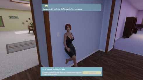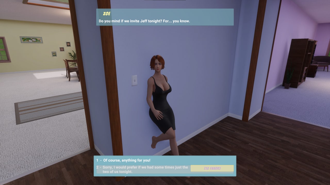 Femdom Wife Game – Zoe, как следует из названия, рассчитана на любителей женского доминирования. Проект содержит в себе множество фетишей, связанных с фемдомом. Например: cuckolding, foot fetish, cum eating, pussy worship, chastity, pegging и так далее. Часть из них можно при желании отключать в настройках игры. Сам проект представляет собой секс-симулятор и симулятор отношений. В нём надо не только заниматься сексом, но и фармить деньги, а также следить за параметрами Lust и Favor. Сюжет посвящен взаимоотношениям протагониста и его жены по имени Зои. Повествование состоит из коротких историй. Они позволяют проследить за тем, как эта женщина постепенно становится доминантной партнершей. Тайтл содержит в себе 50 ивентов.
