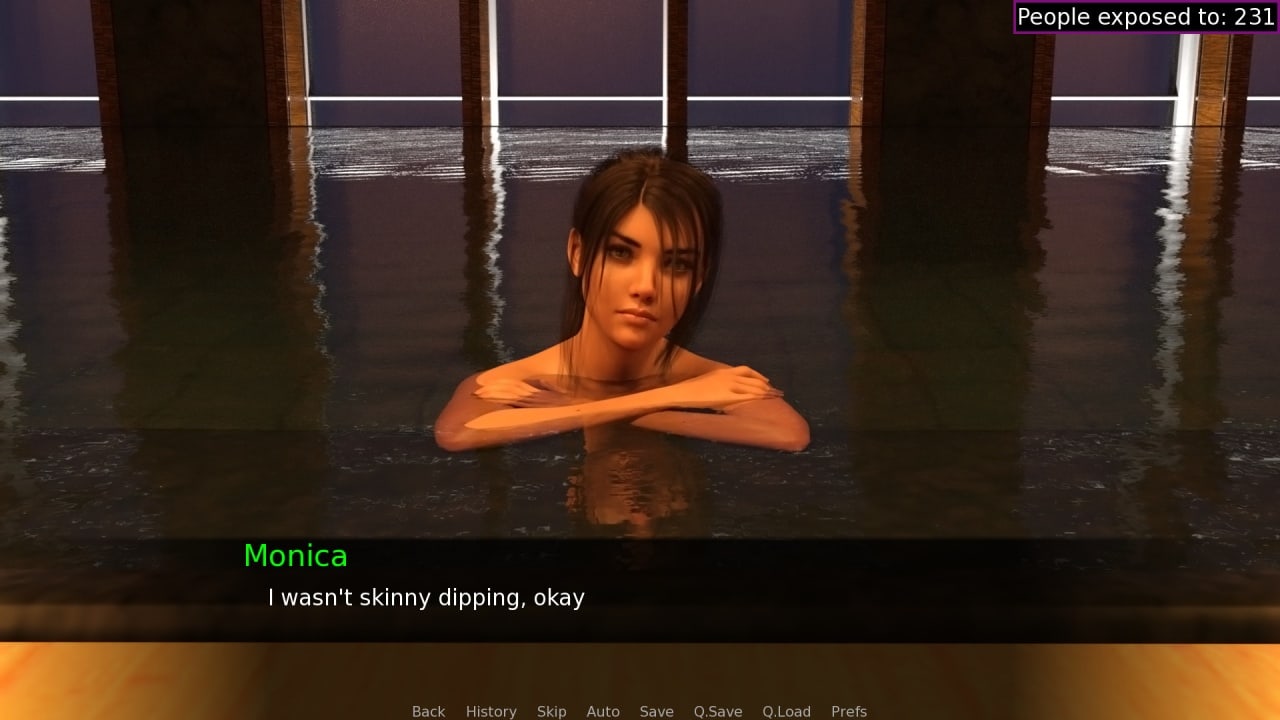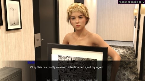 Игра Beth the Exhibitionist рассказывает о приключениях девушки в отеле. Её заперли голой в номере. Теперь женщина хочет добраться до своей одежды. Геймеру отводится роль её приятеля. Игрок должен провести эту барышню мимо охранников, гостей и других людей. Нужно, чтобы как можно меньше количество человек увидело её оголенное тело. Специальный счетчик в правом верхнем углу экрана будет это отслеживать. Также необходимо не позволить службе безопасности арестовать представительницу прекрасного пола. Так как это представитель жанра VN, то здесь нет активного геймплея с элементами стелса. Весь процесс заключается в чтении диалогов или описаний и выборе реплик или действий.