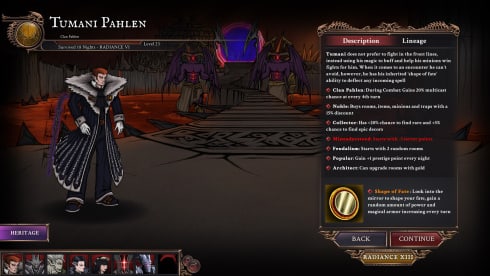Перед началом прохождения игры Еще несколько ночей нужно создать персонажа. Можно выбрать пол, дисциплину (всего их тут 4, и в каждой есть по 30 навыков), один из 8 кланов (между собой они сильно отличаются) и планировку замка. Всё это, кроме гендера, влияет на геймплей. Также присутствует выбор уровней сложности. Всего их 15. В награду за их прохождение открывается дополнительный контент. Например: новые цитадели, лорды-вампиры, предыстории. В каждом забеге юзер получает различные баффы, предметы, навыки. Есть здесь и легендарное оружие. Постепенно геймер зарабатывает очки наследия. Они необходимы для мета-прогрессии.
