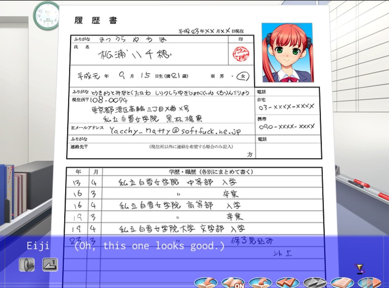 Название игры переводится как Интервью: Вы знаете, что вам нужно сделать, чтобы получить работу. Сюжет посвящен извращенному мужчине по имени Эйдзи Такада. Он является владельцем подставной фирмы Happy Production Company. Протагонист создал фейковую компанию, чтобы с помощью манипуляций заставлять молодых женщин раздеваться и заниматься с ним сексом. Антигерой лично проводит все собеседования. Он отбирает кандидатов только женского пола. Во время общения с ищущими подработку барышнями парень выдает себя за успешного директора и владельца небольшого бизнеса. Он давит на красавиц, чтобы посмотреть на то, как далеко они готовы зайти ради денег. Ему попадаются два резюме. Одно принадлежит зрелой Саске Нисидзаве, а второе – молодой студентке Сяоби.