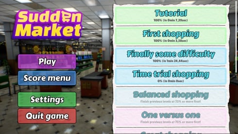 Sudden Market представляет собой аркаду с элементами экшена, трехмерной мультяшной графикой и видом от первого лица. Этот инди-тайтл можно назвать шуточным симулятором покупателя в супермаркете. По сюжету герой приходит в продуктовый магазин вскоре после его закрытия. Протагонист не собирается уходить. Он берет тележку и всё равно пробует заняться шопингом. Однако сотрудники службы охраны отказываются просто так на это смотреть, и потому стремятся ему помешать. Поведение этих врагов зависит от развиодности сложности. Всего их 3: легкий, средний и трудный. В самом начале можно пройти обучение и освоиться с механиками.