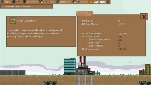 Frack the World - это захватывающая стратегия посвященная управлению ресурсами, в которой вы берете на себя роль генерального директора компании, занимающейся гидроразрывом пластов. Ваша цель - максимизировать прибыль, одновременно справляясь с постоянно меняющимся состоянием окружающей среды. От вас требуется отслеживать четыре основных фактора деятельности вашей компании: добываемую нефть, деньги, которые вы зарабатываете, ущерб, который вы наносите окружающей среде, и общественное мнение о вашей компании.
