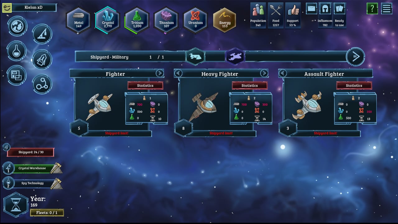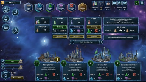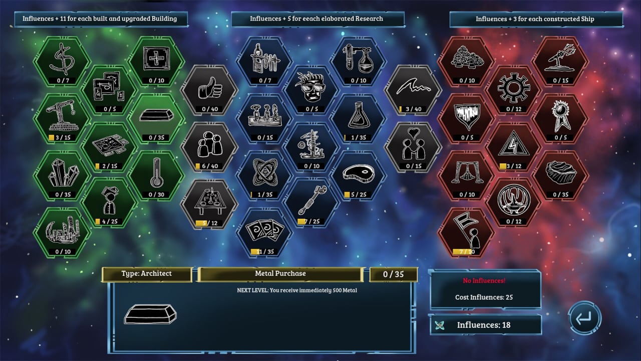 В начале истории вы можете выбрать один из трех классов персонажей - архитектора, ученого или генерала - каждый из которых обладает уникальным набором способностей, которые вы будете совершенствовать и использовать на протяжении всего прохождения. Однако вы всегда можете приобрести два других пакета способностей, чтобы разнообразить свою стратегию. Выбранный вами класс персонажа также определяет добычу основных ресурсов, снижая стоимость зданий, исследований и кораблей, что существенно влияет на вашу стратегию. Чтобы завершить игру, вам необходимо выполнить все выбранные вами условия победы, такие как технологическое развитие, максимальная репутация с другими фракциями, захват всех планет или получение определенного количества очков. Чтобы развивать свою империю, вам нужно каждый ход решать, какие здания модернизировать, исследовать и строить космические корабли, повышая уровень своей империи, чтобы открывать новые технологические чертежи.