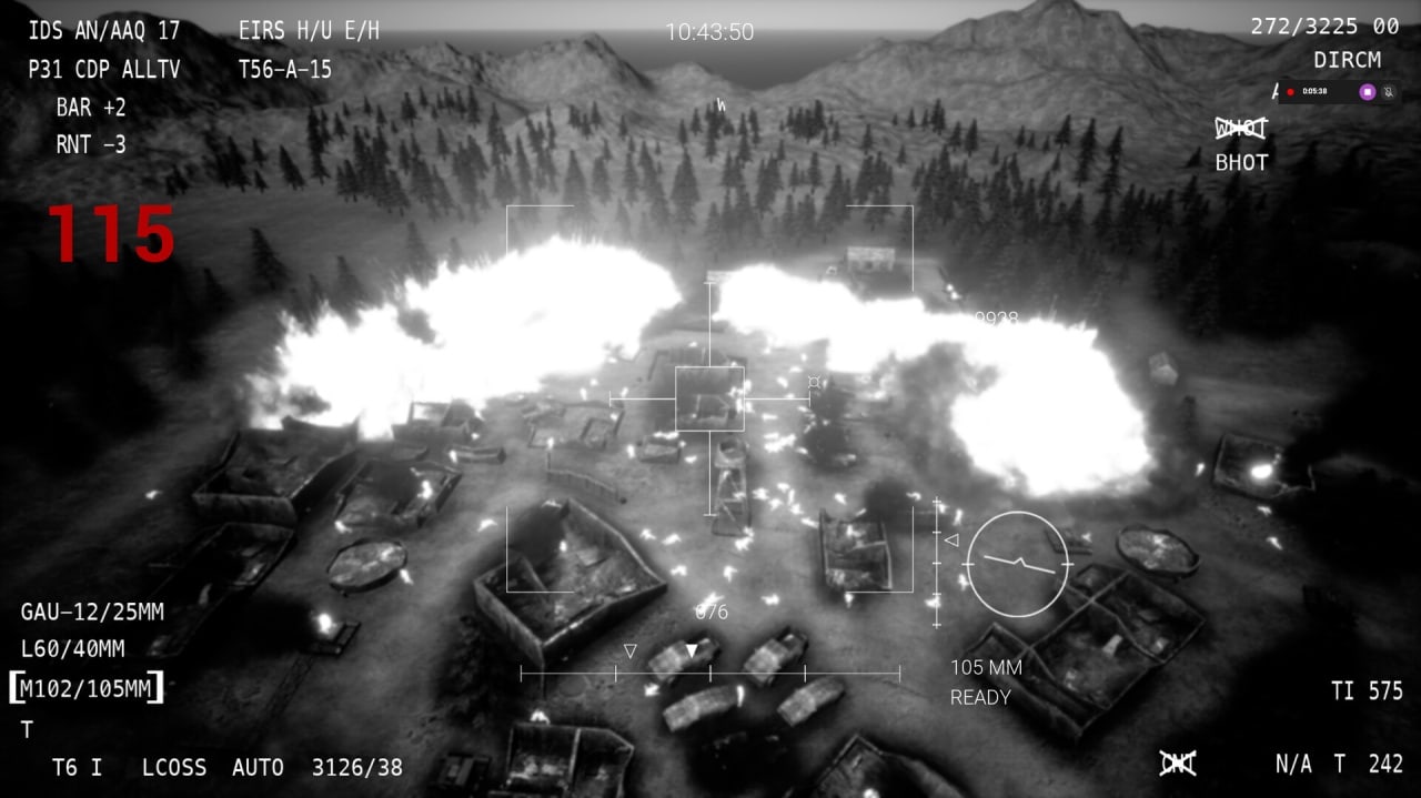 На данный момент в игре есть только два бесконечных уровня, но скоро будет введен режим кампании. В игре нет ни сюжета, ни развития, но кому это нужно, когда можно просто взорвать все вокруг? Обратите внимание, что умереть невозможно, разве что застрелить своих союзников, что приведет к окончанию игры. Возьмите под контроль 25-мм пушку, которая делает 200 выстрелов в минуту, 40-мм пушку с меньшей точностью, но большей смертоносностью, и 105-мм гаубицу, способную разрушить даже самые большие сооружения. Вы также сможете полностью контролировать тепловидение, используя режимы "белая горячка" и "черная горячка" для стратегического обнаружения врагов. Благодаря двум уровням с бесконечной волной возрождения противники будут прибывать, а вы будете набирать очки. Это более аркадный опыт, но все же он требует стратегии, основанной на географии локаций. Приготовьтесь уничтожить все на своем пути с GHOST: AC-130 Close Air Support.