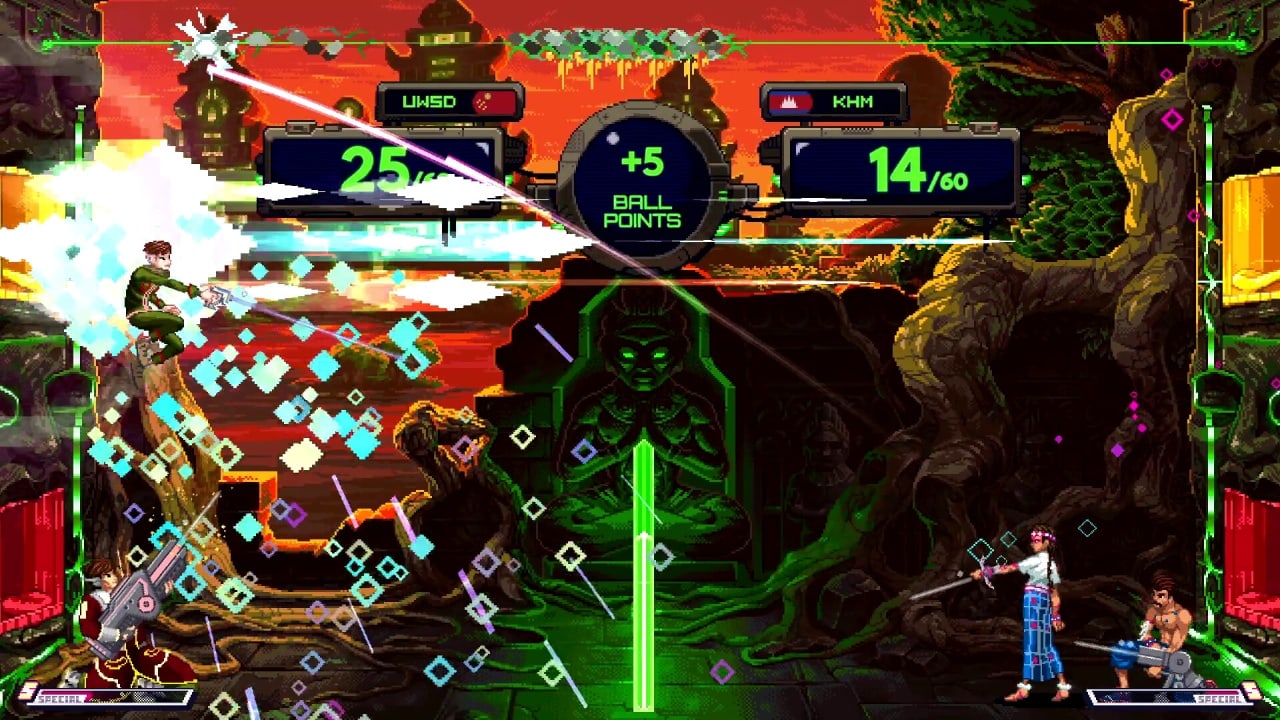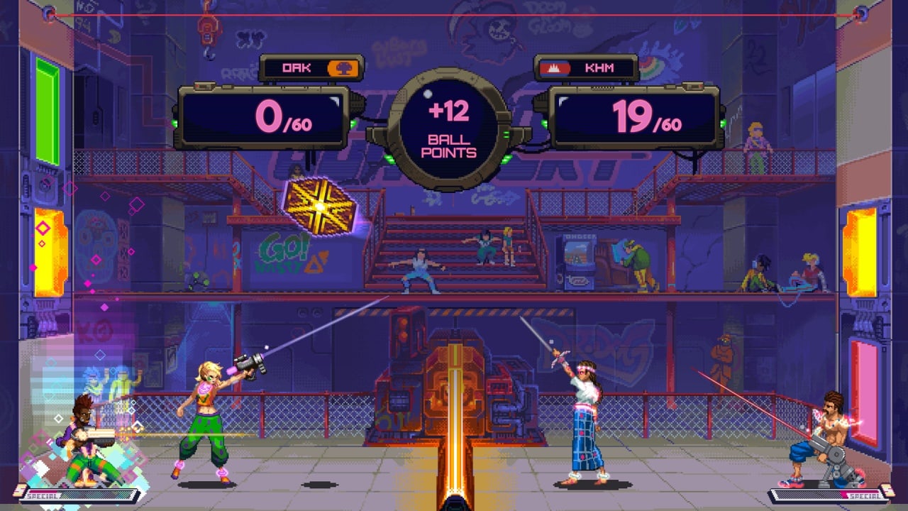 Каждая команда также имеет свое собственное специальное оружие, которое разблокируется с опытом игры. Это оружие требует от игроков быстрого реагирования и изменения игровой ситуации. Предусмотрено семь уникальных арен со своими собственными особенностями, от ворот, которые открываются и закрываются или меняют значение очков, до движущихся сеток и нестабильных поверхностей.