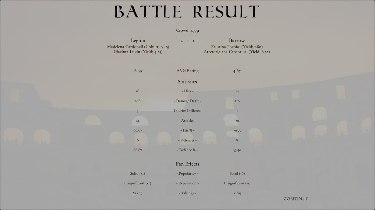 Gladiator Manager приглашает геймеров в мир кровавых битв, где ты - менеджер команды гладиаторов, который должен выиграть не только чемпионат, но и кубок. Это симулятор спортивного менеджмента и тактических боев с текстовой составляющей. Тебе предстоит набирать новых бойцов, оценивать их потенциал и навыки, тренировать и выбирать наиболее подходящую комбинацию для победы над соперниками. Гладиаторы могут быть ветеранами, гражданами, преступниками или рабами, каждый со своими уникальными игровыми механиками и характеристиками, и подразделяются на шесть классов: гладиатор, разбойник, варвар, защитник, ретиарий и лидер. Каждый класс может гибридизироваться, выбирая умения из других деревьев.