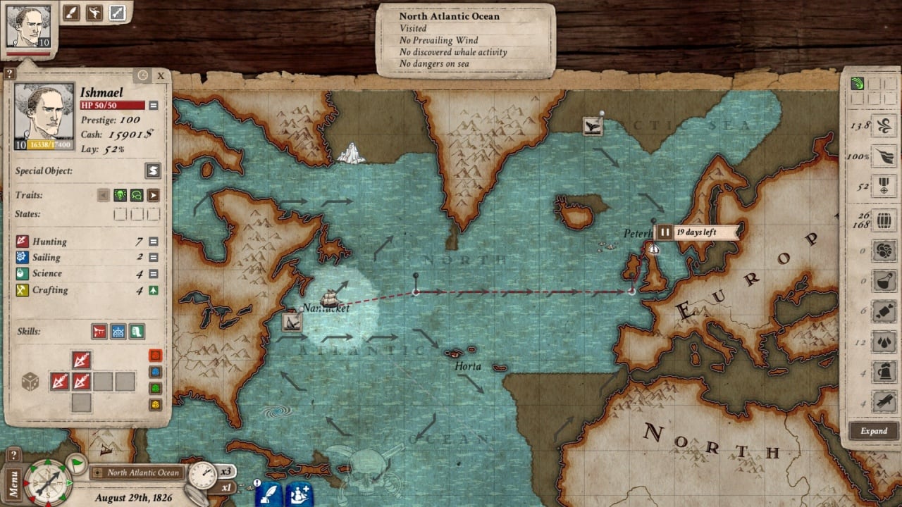 Персональная статистика центрального героя увеличивается в зависимости от общих достижений команды на судне. Управляйте своим кораблем и командой, ставьте перед ними задачи на личном корабле и модернизируйте судно дополнительными отсеками, увеличивая характеристики вашего морского транспорта. В игре присутствует борьба с пиратами, которые могут полностью вас уничтожить. В игре предусмотрена смена погоды, штормы и другие случайные события, которые могут полностью уничтожить судно. Всё это нужно как можно быстрее обнаружить, вовремя поменять курс корабля или вовсе отступить от поставленной цели. Графическая часть представлена в стиле 2D визуализации. Музыкальная дорожка напоминает саундтреки из Пиратов Карибского моря, но с сильно изменёнными мотивами. Разблокируйте для себя свежие районы китобойного промысла, добывайте китовое мясо и создавайте мощный крейсер против пиратов, используя пошаговую боевую методику.