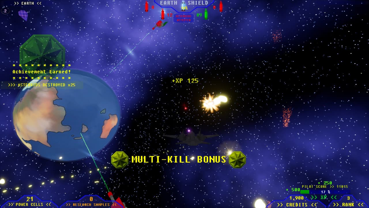 Asteroid Defender - это превосходная космическая игра-стрелялка, которая испытает ваши навыки пилотирования на прочность! Как элитный пилот, завербованный в Силы обороны Земли, вы должны защитить наш мир от надвигающейся угрозы приближающихся астероидов. И позвольте мне сказать вам, что это будет нелегкая поездка! Приготовьтесь к запуску в космос и возьмите на себя управление космическим истребителем X-33, чтобы принять участие в стремительных, полных адреналина сражениях против шквала астероидов, несущихся к Земле. Но это еще не все! Вам нужно будет следить за энергетическими ячейками, разбросанными по всему космосу, и собирать их, чтобы поддерживать земной щит в рабочем состоянии.