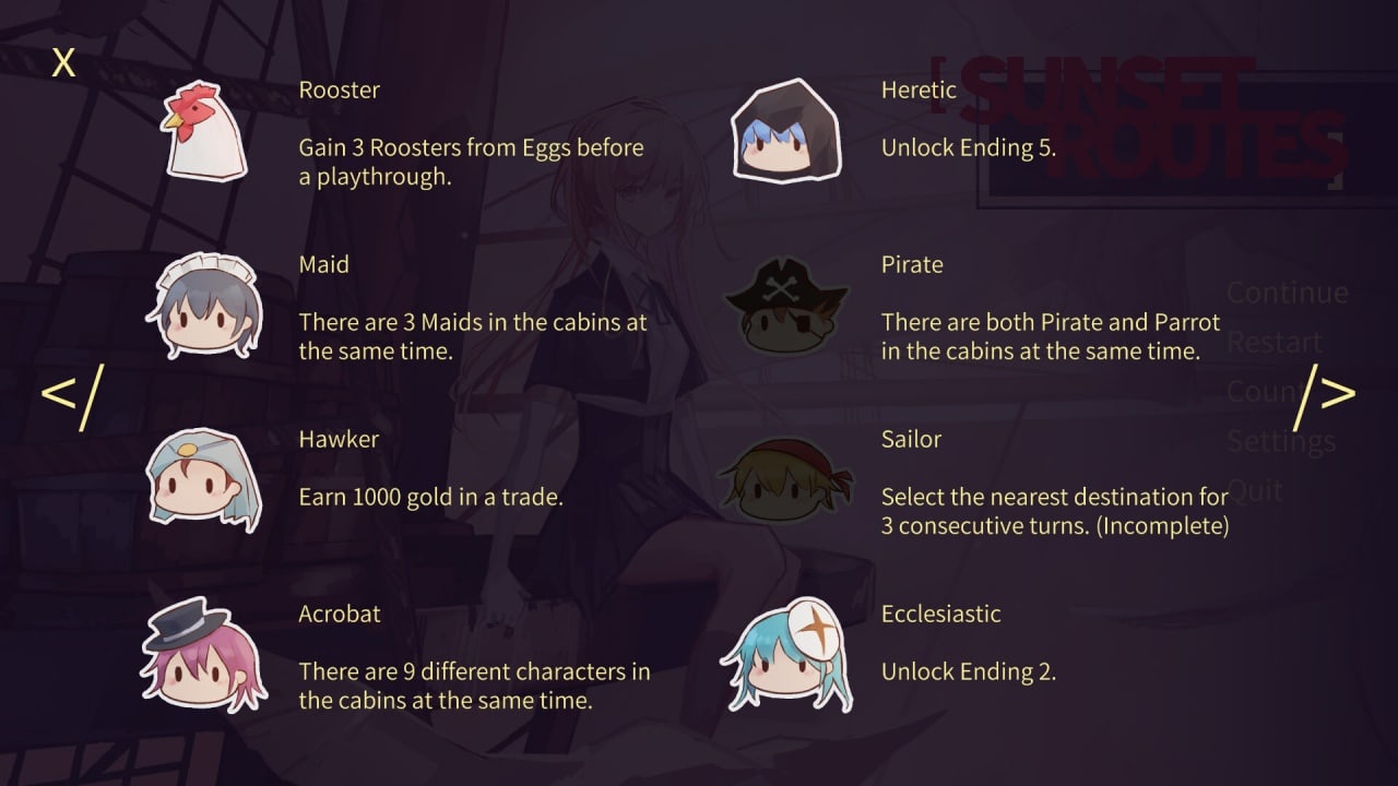 По мере прохождения игры вы будете сталкиваться с различными событиями и препятствиями, которые потребуют от вас принятия стратегических решений. Ваш выбор повлияет на перевозимый вами груз и заработанные вами деньги. Следите за требованием денег каждые 5 ходов, так как невыполнение этого требования может привести к тяжелым последствиям. Sunset Routes предлагает несколько концовок и достижений, что гарантирует уникальность каждого прохождения игры. Так чего же вы ждете? Поднимайте якорь и отправляйтесь навстречу незабываемым приключениям!