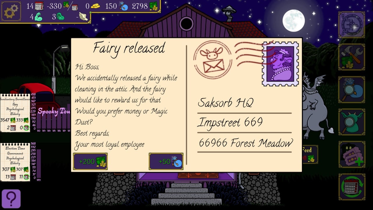 Spooky Mansion Manager - это увлекательный менеджер, в котором вам предстоит создать незабываемые экскурсии в замке, который вы унаследовали от своего дедушки. Ваша цель - заработать сто золотых слитков за как можно меньшее количество недель, чтобы погасить его долг. В этой игре вы сможете осуществить мечту своего деда, унаследовав его бизнес вместе с замком. Создавайте увлекательные экскурсии, собирайте Магическую Пыль для исследований, ремонтируйте помещения, заботьтесь о сотрудниках и выплачивайте долг, который взял родственник. Дедушка взял взаймы сто золотых слитков, так как его бизнес находился в упадке, и теперь это задача для вас - погасить долг, сохраняя при этом процветание бизнеса.