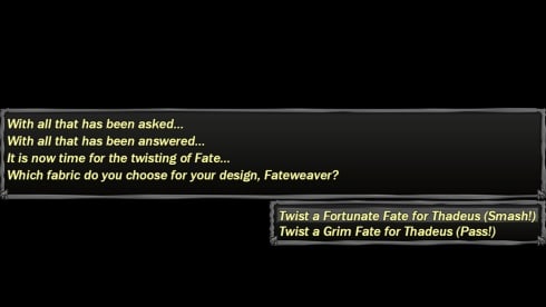 В этом эпизоде вы познакомитесь с Тадеусом Манканноном, глуповатым людоедом, которого одолели печаль и гнев. От вас зависит, поможете ли вы ему преодолеть его внутренних демонов или еще больше ввергнете его в безумие. Выберете ли вы SMASH или PASS? Будьте внимательны, решения, которые вы примете, окажут значительное влияние на судьбу тех, кто вас призовет. Готовы ли вы принять вызов The Fateweaver и оставить свой след в мире игр? Выбор за вами...