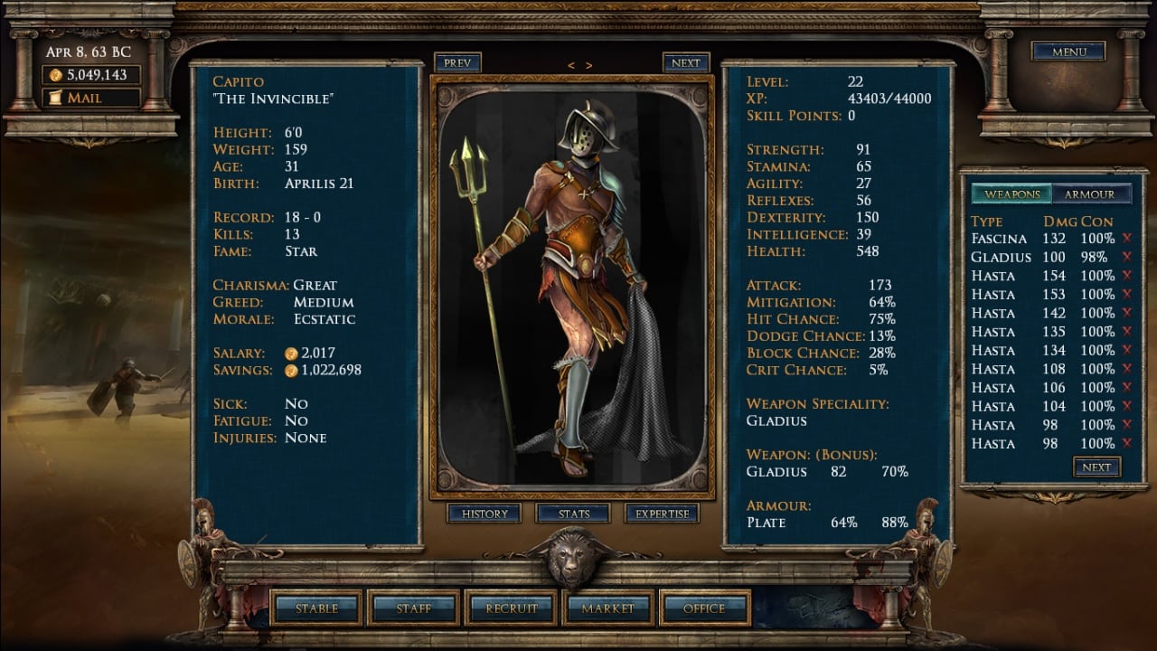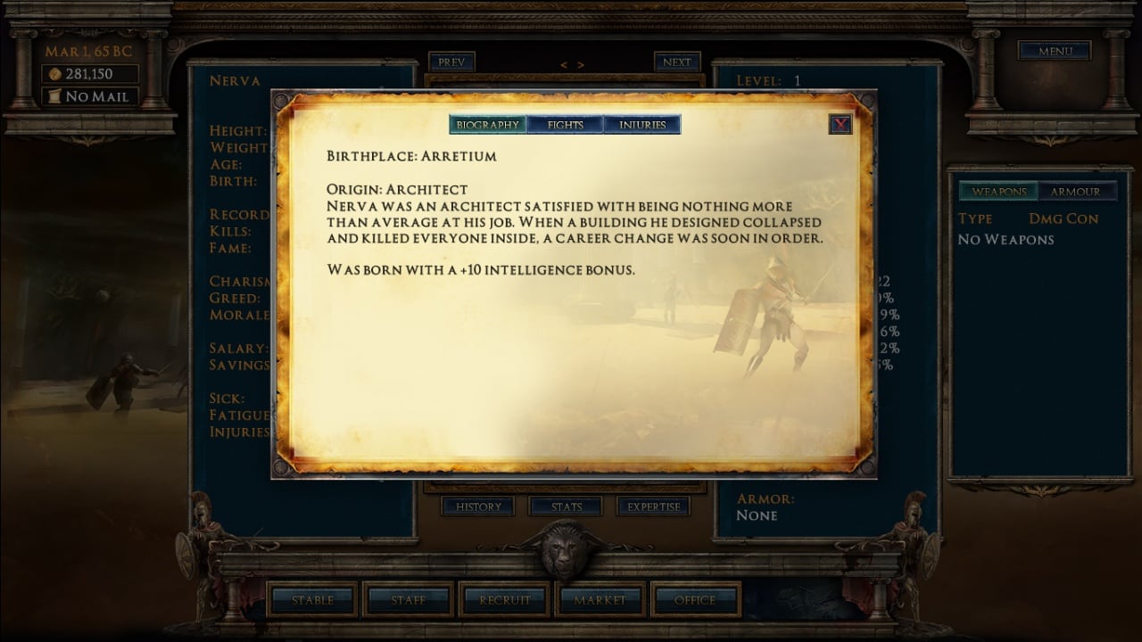 Первоначально нам будет предоставлена небольшая денежная сумма и полное отсутствие воинов. Выберите воинов и совершите первый взнос, всё это делается для начала боёв на арене. Вы должны учитывать травмы, настроение и силу бойца, ведь от этого может зависеть исход сражения. В магазине всегда можно приобрести аптечки, всевозможное оружие и экипировку, чтобы усилить подопечного. Каждую потребность своего подопечного нужно незамедлительно удовлетворять.