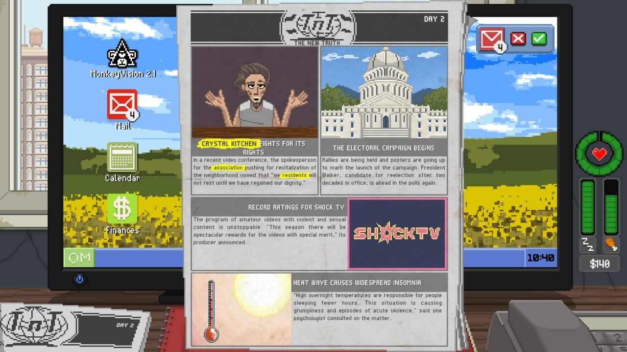 Такая концепция порождает множество уникальных и комичных ситуаций. Персонажи под нашим наблюдением по-своему безумны и интересны, а их жизнь оказывается далеко не такой тривиальной, как можно было бы предположить. Мы узнаём все секреты и повадки людей, что иногда выливается в шокирующие открытия. Также эта игра является настоящим симулятором интроверта. Кроме нашей работы, игроку нужно заказывать еду, записывать всё увиденное в блокнот, заходить в местный интернет. Всё это неслабо ломает четвёртую стену, что в играх встретишь редко.