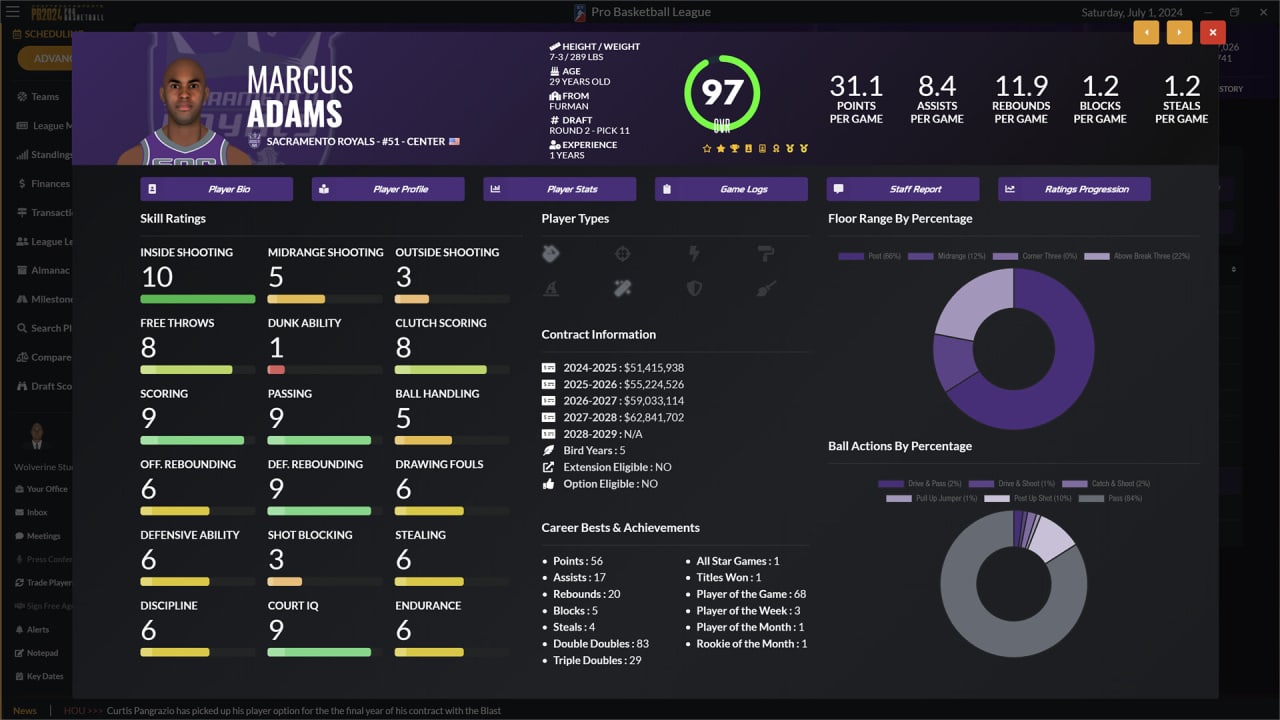 Draft Day Sports: Pro Basketball 2024 предлагает увлекательный симулятор баскетбола, позволяющий игрокам стать на место генерального менеджера любимой команды. Глубина игры заключается в том, что она позволяет контролировать все аспекты деятельности команды: от драфта и торговли до подписания свободных агентов и формирования тренерского штаба. Реалистичный игровой движок, сопровождаемый обширным альманахом статистики и рекордов, обеспечивает захватывающий опыт управления.