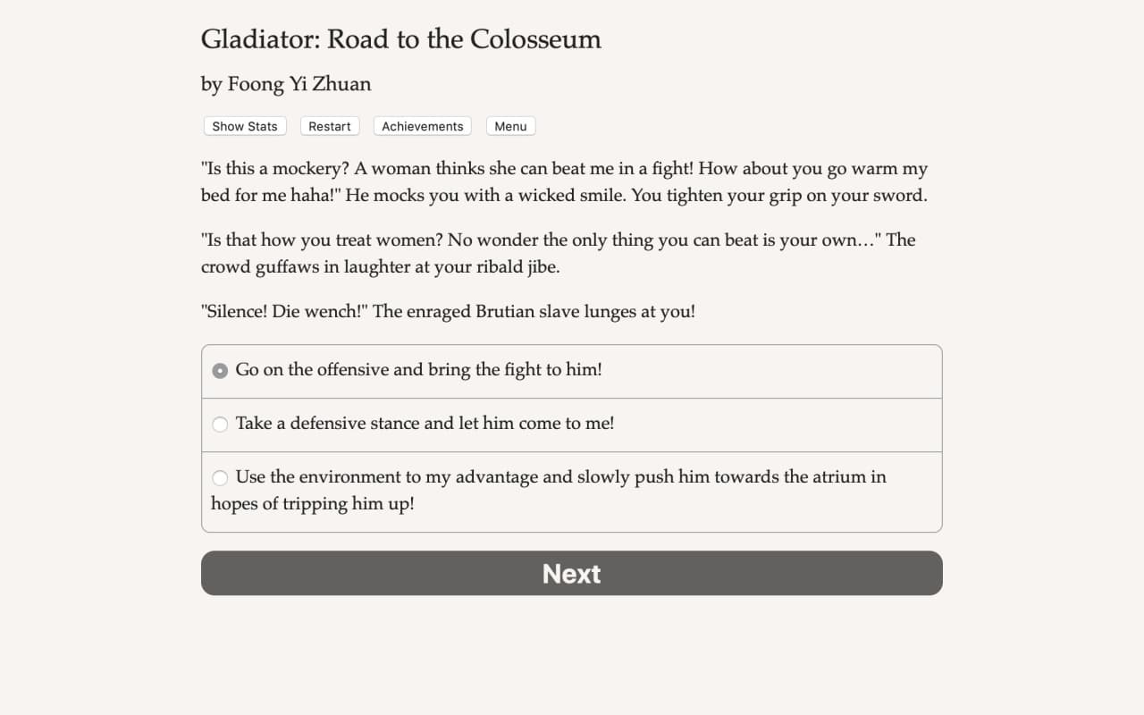 Gladiator: Road to the Colosseum приглашает облачиться в доспехи гладиатора и отправиться на поиски славы и выживания на неумолимой арене. Эта текстовая РПГ погружает игроков в захватывающее повествование, где стратегические боевые решения и судьбоносные выборы определяют судьбу гладиатора. Арена служит полем битвы за мастерство и стратегию, используя простую, но увлекательную пошаговую боевую систему. Вооруженные арсеналом оружия и репертуаром боевых стилей, игроки стратегически ориентируются в сложностях выбора времени, позиционирования и применения специальных приемов, чтобы одолеть противников и добиться победы.