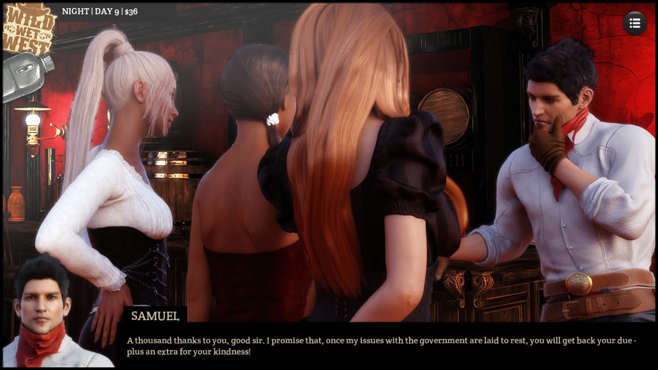 Wild Wet West RUS v 1.0 Новая версия Полная версия Последняя Дата выхода 24 дек. 2021 Разработчик Lesson of Passion Жанр Приключения, Визуальная новелла, Инди Обновлено 20 февраля 2025, 03:04 Список изменений Wild Wet West переносит вас в эпоху Дикого Запада, где вы играете за Сэмюэля Нейшена, мошенника, который ищет новые жертвы и возможности. Вы встретите трех харизматичных женщин, которые могут помочь или помешать вам в вашем стремлении ограбить банк: Кейт, местный шериф, Белла, танцовщица и проститутка, и Наира, невинная девушка из индийской деревни. Тайтл представляет собой упрощенный симулятор знакомств, в котором вам предстоит взаимодействовать с женщинами и грамотно выбирать свои действия. В зависимости от принятых решений вы можете создавать с ними союзы, романы или соперничать. Каждая женщина имеет свою индивидуальность, предысторию и цели, и вам придется балансировать между отношениями с ними, преследуя при этом свои собственные цели. Проект предлагает несколько концовок, в зависимости от того, как вы завершите свое ограбление и что произойдет с женщинами. Кроме того, в зависимости от уровня близости и доверия, можно открыть различные сцены и диалоги с ними. Тайтл имеет юмористический тон и красочный художественный стиль, соответствующий тематике Дикого Запада. Wild Wet West - это игра, которая понравится любителям приключений, романтики и комедии. Это адвенчура, позволяющая испытать острые ощущения от работы мошенником в беззаконной стране, где можно встретить интересных персонажей и определить свою судьбу. Если вы ищете веселую и увлекательную игру, которая заставит вас смеяться и заинтересует, это то, что вам нужно. Скачать торрент Скриншоты Показать больше Видео из игры Скачать Wild Wet West Тип релиза Пиратка (Таблетка: Не требуется) Версия v 1.0 (Полная) Последняя Размер 1.07 ГБ Интерфейс Русский Озвучка Отсутствует Установка: Скачать .torrent торрент файл Скачать БЕЗ торрента прямая ссылка через uTorria Системные требования ОС: Windows 7, 8, 10 (64 бита) Процессор: 2.0 Ghz+ Оперативная память: 2 ГБ Видеокарта: 256 МБ Место на диске: 1 ГБ Нагота, Казуальная, Решения с последствиями, Игры в 2D, Юмор, Романтика, Эмоциональная, Вестерн