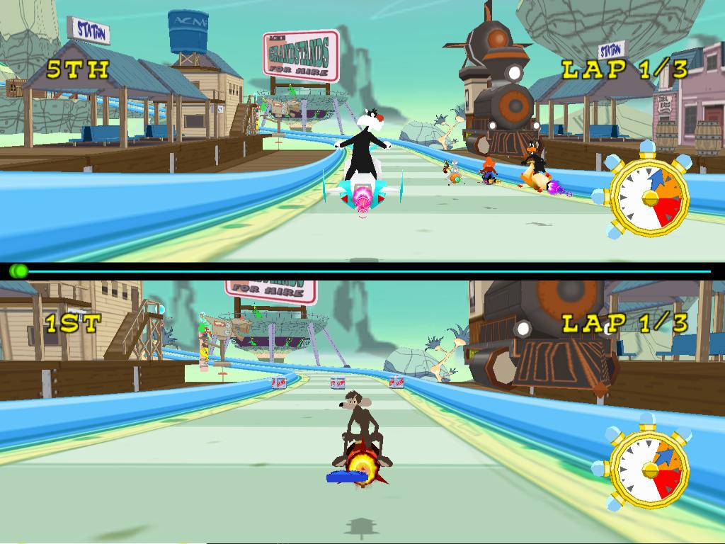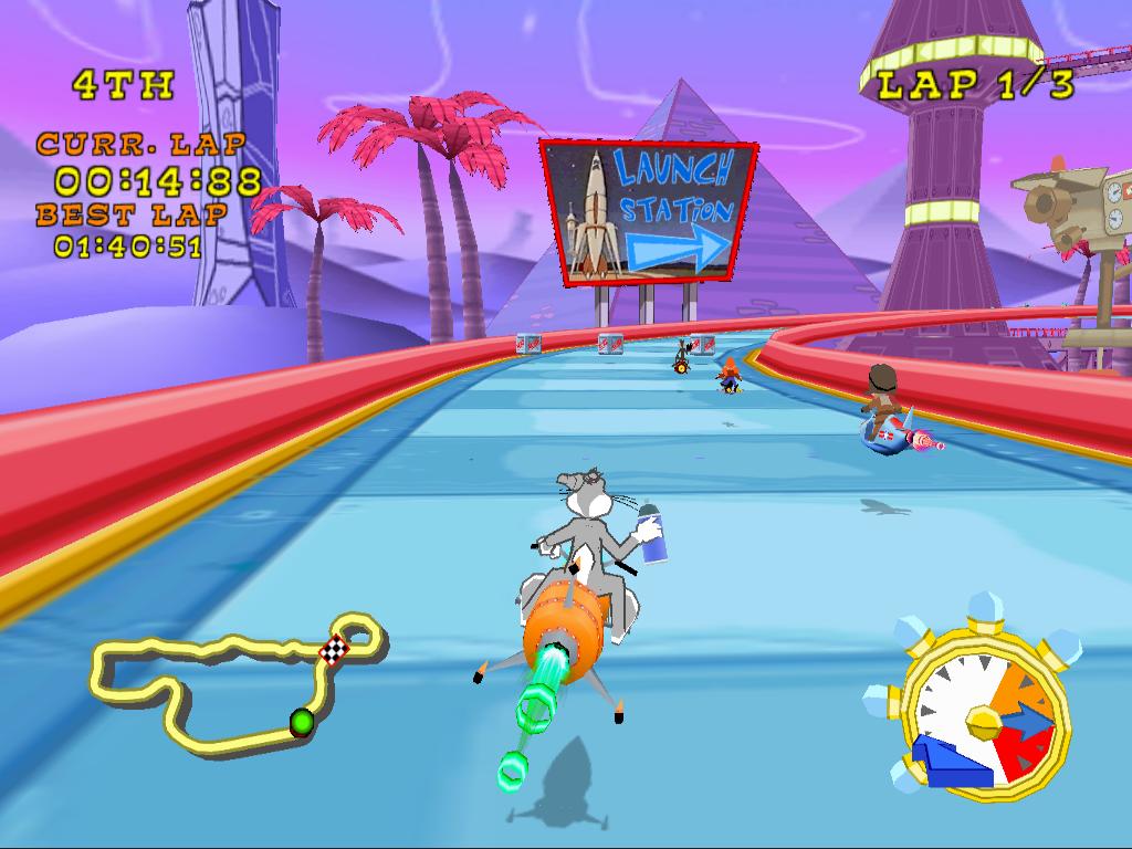 Looney Tunes: Space Race - это олдскульная аркадная гонка на разнообразных картах с участием сумасбродных персонажей Looney Tunes. Игроки выбирают одного из девяти гонщиков, включая Багза Банни, Даффи Дака, Порки Пига, Сильвестра, Таза и Марвина Марсианина. Цель игры проста: промчаться на своей ракете по двенадцати уникальным трассам и первым пересечь финишную черту. Однако не все так гладко. Остерегайтесь ловушек и препятствий, разбросанных по трассам, и будьте готовы к тому, что ваши противники будут играть грязно. К счастью, вы можете дать им отпор!