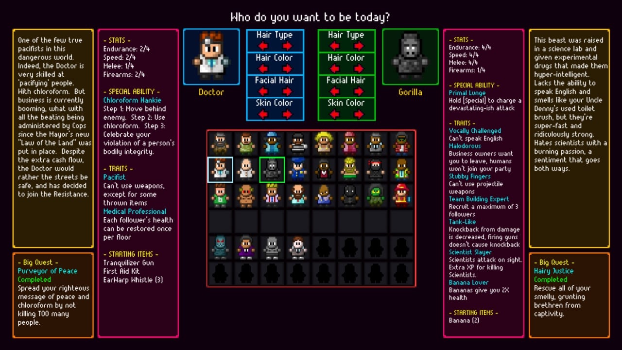 Выбрав класс протагониста, пользователь начнет свой путь с нижнего этажа. Сначала геймеру откроются шесть персонажей из двух десятков возможных, которые будут доступны в процессе. Героям можно выбрать причёску, глаза и цвет кожи, но все они обладают собственной биографией и навыками и заданиями. К примеру, хакер должен предотвратить кибератаку, полицейский сможет преуспеть в своей работе. Действия происходят в городе-здании, поэтому пройти предстоит много уровней, чтобы добраться до противника, обитающего на верхнем этаже. В процессе пользователя ждет масса занятий. Персонаж будет рыться в мусоре, охотиться на копов, совершать ограбления и взламывать терминалы.