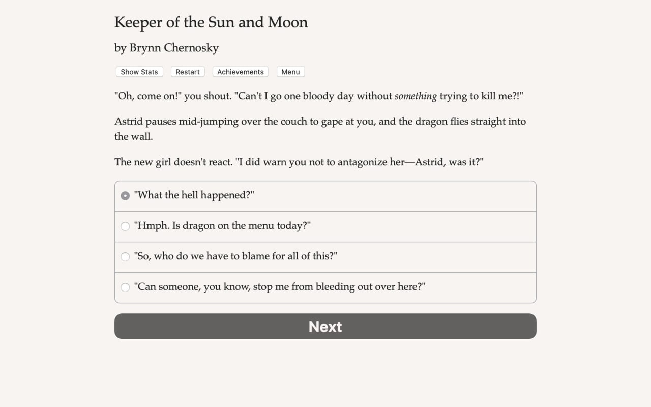 Keeper of the Sun and Moon погружает вас в мир сверхъестественной жизни колледжа. Этот интерактивный фэнтези-роман ставит вас на место водителя, и ваш выбор определяет ход повествования. Забудьте о причудливой графике и звуковых эффектах, Keeper of the Sun and Moon полагается на силу вашего воображения. История начинается с не самого обычного первого года обучения вашего персонажа. После того как нападение горгоны нарушает привычный уклад жизни в колледже, вы отправляетесь в Академию Магов Нового Мира. Это не совсем обычный колледж - он предназначен для тех, кто обладает сверхъестественными способностями. Ситуация в Новом городе магов напряженная, идет война между ангелами и демонами. К тому же были похищены мощные небесные артефакты, что еще больше усиливает напряженность. Keeper of the Sun and Moon предлагает широкие возможности кастомизации.