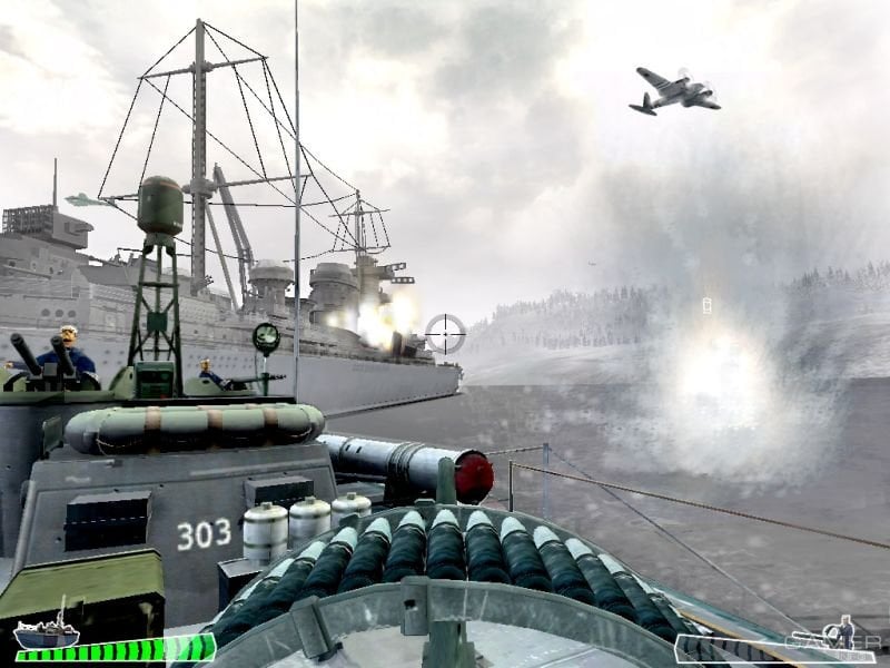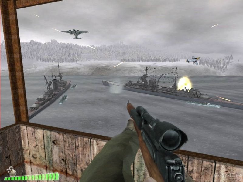Огромный плюс игры 1944: Огненные рубежи – множество миссий с разнообразной техникой. Прокатитесь на танке, громя всех мощными снарядами, плывите по волнам на военном катере, управляйте зенитной пушкой или пулеметом, установленным на броневике. На каждом уровне предстоит уничтожить определенный список врагов. Поражайте обычную пехоту, сидящую за деревьями или в окопах, либо взрывайте вражеские самолеты, корабли или другую военную технику. Ловите врагов на перекрестие прицела и не медлите с выстрелами. Это и есть весь геймплей игры. Операция, в которой вы примете участие, происходит зимой. Все локации будут заснежены, а враги замаскированы. Примите роль бордстрелка на самолете, управляйте пушкой на катере и выполняйте разнообразные задания.