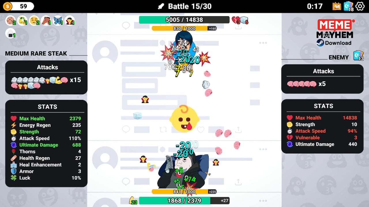 Meme Mayhem бросает вас с головой в дикий мир интернет-культуры, но на этот раз вы не просто скроллите - вы орудуете мемами как оружием. Эта адвенчура переворачивает с ног на голову жанр ролевых игр, превращая социальные сети в поле битвы за славу и известность (а может, и просто за пару смешков). Основу геймплея составляют быстрое мышление и стратегическое использование эмодзи. Каждое ваше решение - от выбранных перков до добытых реликвий - может полностью изменить ваш подход. Хотите быть танкующим добрым самаритянином, поглощающим урон своих последователей?