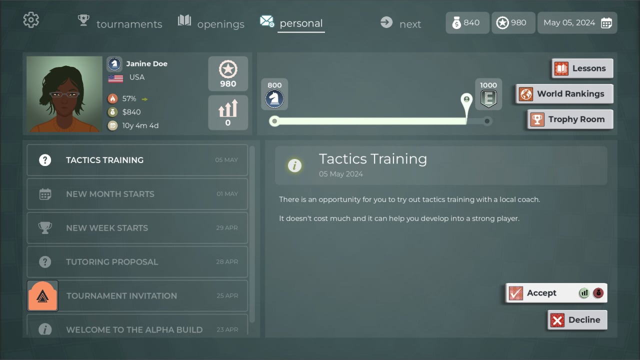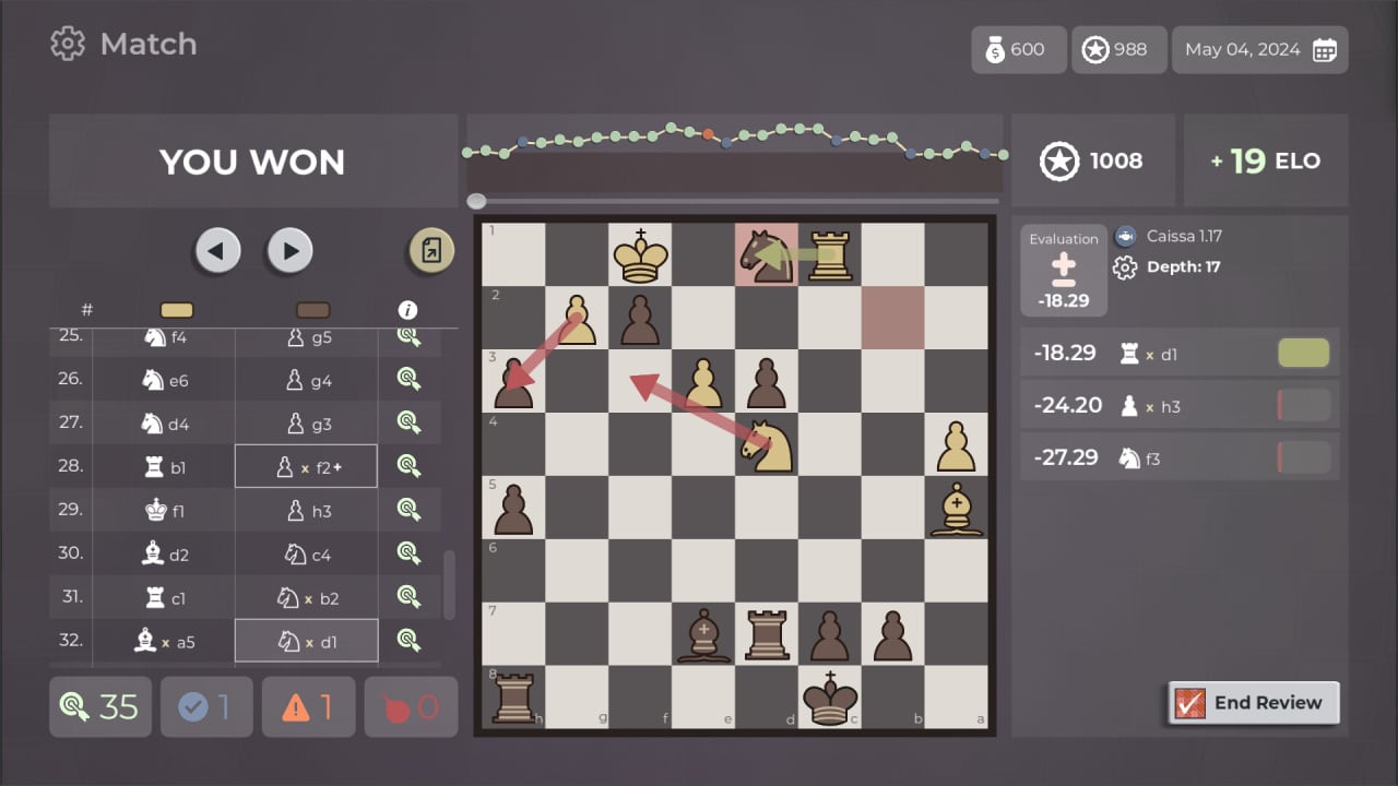 Master of Chess с головой окунает вас в мир соревновательных шахмат. Эта игра, разработанная одним разработчиком под брендом BRANE, не просто перемещение фигур по доске. Это полноценный симулятор шахматной карьеры, позволяющий вам испытать все взлеты и падения жизни профессионального шахматиста. Вы начинаете как начинающий талант с большими мечтами. Ваша цель? Подняться по карьерной лестнице и стать всемирно известным шахматным мастером. Тайтл бросает вам реалистичные и сложные матчи, заставляя разрабатывать стратегию и думать на несколько ходов вперед. Не волнуйтесь, вы не останетесь в подвешенном состоянии. ИИ-наставник проведет вас через все тонкости игры, помогая выбирать хитрые начальные ходы и перехитрить соперников в захватывающих эндшпилях.