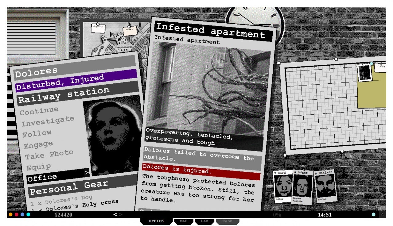 Daily Chthonicle: Editor's Edition Дата выхода 30 сен. 2016 Разработчик Sinister Systems Жанр Симуляторы, Инди, Приключения, RPG В основном положительные на основе 75 обзоров в Steam 73% Торрент ожидается Добавьте в избранное, чтобы следить События Daily Chthonicle: Editor's Edition происходят в некоем Городе, расположенном посреди вдохновлённой Лавкрафтом Америки 40-х годов. Здесь постоянно происходят преступления и загадочные события, связанные с потусторонним. Очевидцы сообщают о зомби и вервольфах, по улицам разгуливают меняющие тела убийцы, а призраки и шёпот древних богов сводит людей с ума. Протагонист же во всём этом хаосе — редактор местной газеты. Его призвание и цель — доносить до гражданских правду о происходящем вокруг. Впрочем, работа редактора в Daily Chthonicle не подразумевает личные встречи с паранормальным. Вместо этого протагонист отсылает на места происшествий 6 подчинённых. Происходит все исключительно в текстовом формате. Сначала герой получает сведенья о происшествии: что, где и когда случилось, свидетельства очевидцев. Затем он выбирает детектива для работы и настраивает тому экипировку. Набор подопечных, как и их личностные характеристики, каждое прохождение генерируются случайно. Такой же процедурной генерации подчинены и расследуемые дела. После прибытия на место, подчинённые какое-то время работают над заданием. Затем они могут в лучшем случае сразу принести данные, а худшем — наткнуться на событие. Иногда это загадочные послания, разговоры с местными, кусочки расследования, но порой случаются и встречи с противниками. Исход же происшествие решается выбором правильных действий и назначенной экипировкой. После добычи достаточного количества данных можно выставить статью в газету. За это перепадают деньги, нужные для покупки снаряжения. Учитывая жанр роуглайка, процесс можно повторять бесконечно с новыми условиями и результатами. Скачать торрент Скриншоты Показать больше Видео из игры Скачать БЕЗ торрента прямая ссылка через uTorria Системные требования ОС: 7, 8, 10 Процессор: 1.8 GHz Оперативная память: 1 ГБ Видеокарта: Even integrated laptop video is ok. Место на диске: 500 МБ Казуальная, Хорроры