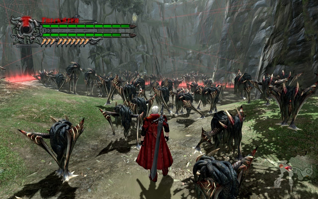 О героях. Неро — новый персонаж. В руках у него револьвер «Голубая Роза» и меч «Алая королева». У меча есть специальные EX-заряды, с которыми атаки усиливаются, но тратится один заряд. Если персонаж использует свою Дьявольскую Руку, то наносит дополнительный урон, а также может притягивать врагов или притягиваться самостоятельно. Если он в дьявольском обличье, то его дух с мечом Ямато будет наносить те же удары, что и хозяин. Данте остался прежним. За него мы будем играть с середины игры. С самого начала игроку открывается 4 стиля боя, которые Данте может совершенствовать, покупая за уровень. Позже открывается пятый стиль. Их можно менять во время боя. Также он может использовать любое найденное оружие. В дьявольском обличье наносит больше урона, в мелкие монстры не могут его оглушить.