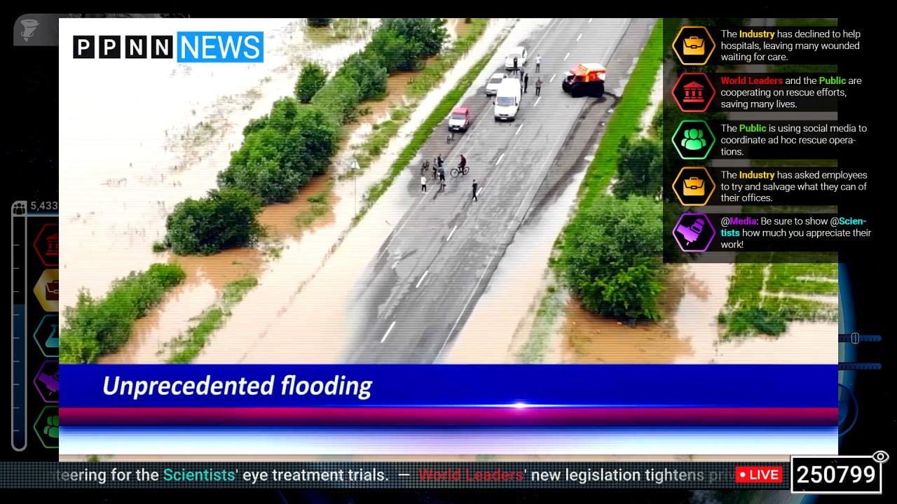 Ветвящаяся структура повествования порождает различные сценарии при каждом прохождении игры. Принятые решения отражаются на социальной структуре, заставляя игроков соизмерять индивидуальный успех с выживанием группы. Голосование за эвакуацию перед надвигающейся гибелью может спасти жизни людей, но вызвать гражданские беспорядки. Корпоративные инициативы по сокращению выбросов могут защитить окружающую среду, но при этом сократить прибыль.