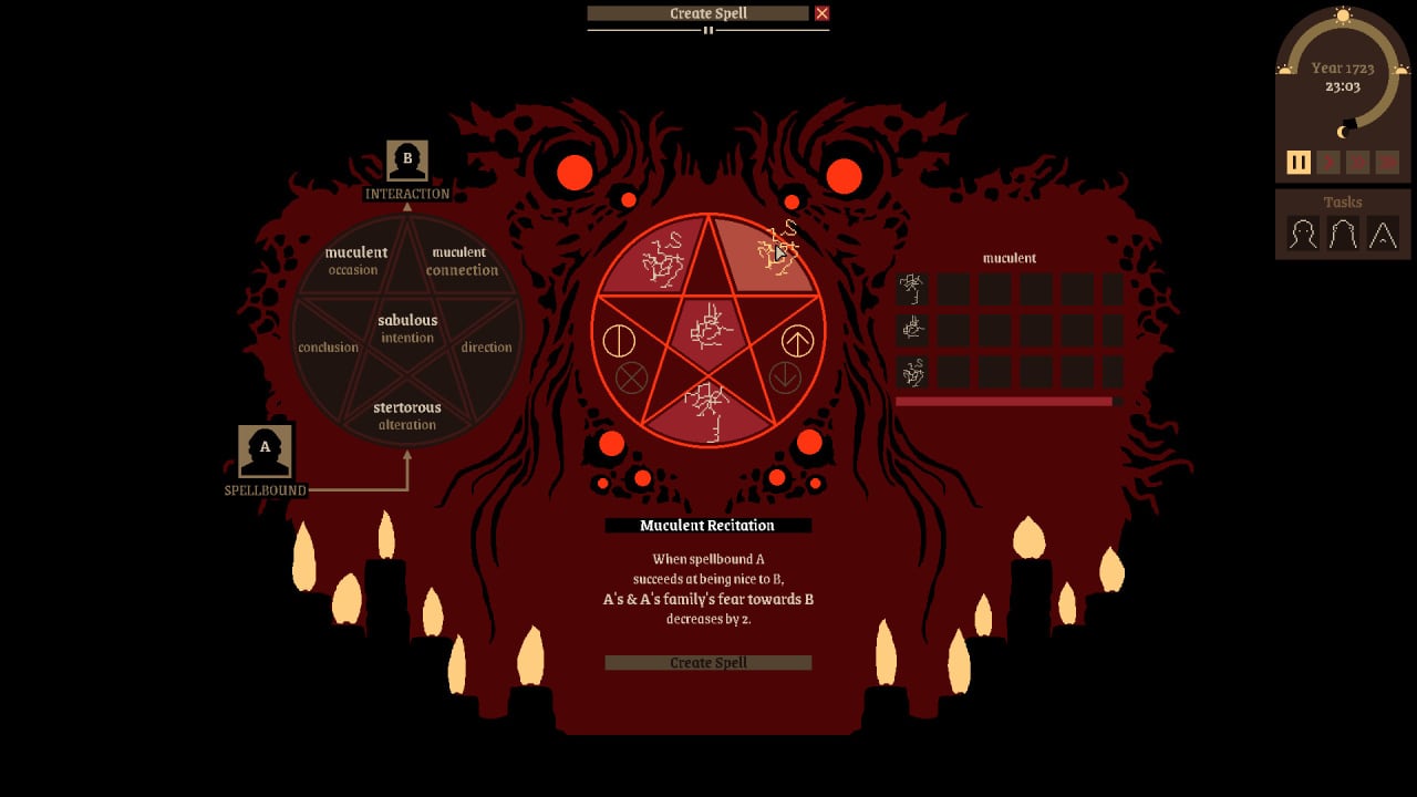 Сюжет не следует фиксированному сценарию, а включает в себя случайные сюжетные элементы, которые соединяются в более широкое повествование. Сюжет развивается благодаря вашим действиям, а не выбору ответов из нескольких вариантов. Магия позволяет вам разрабатывать креативные способы манипулирования жителями деревни. Изучая документы, вы можете узнать сигилы, которые можно объединять в заклинания или использовать по отдельности для наложения проклятий на домочадцев. Гримуар дает вам возможность следить за чувствами, отношениями, поступками и мотивами всех жителей поселения.