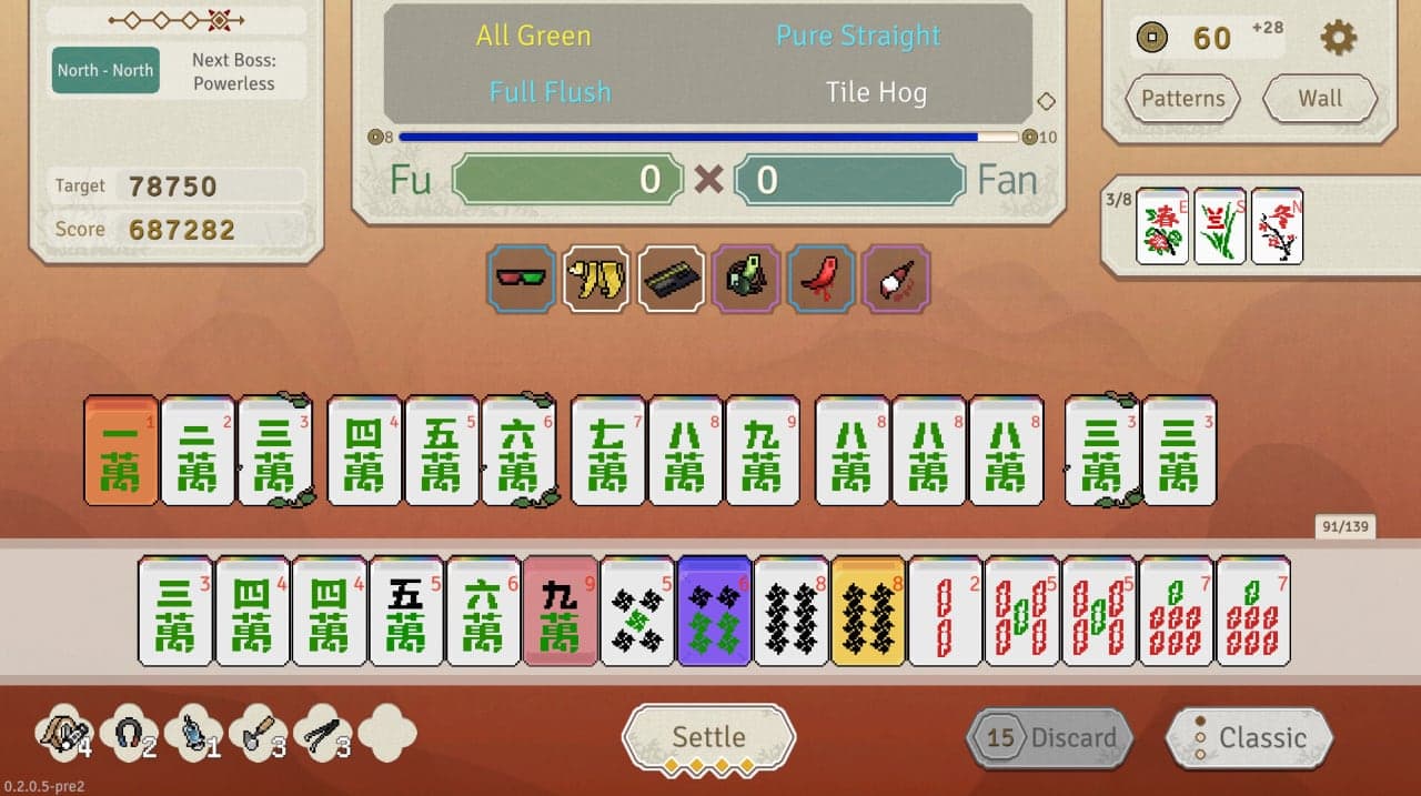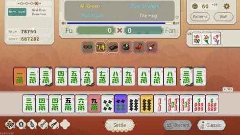 Маджонг, с его региональными вариациями и глубокими стратегиями, служит основной основой, но тайтл расширяет эту концепцию в нечто новое, обеспечивая одновременно знакомый и свежий опыт для поклонников классической игры. В Aotenjo: Infinite Hands представлен богатый набор механик, где привычные для Маджонга стратегии на основе плиток сочетаются с техниками построения колод. Геймерам предстоит овладеть разнообразными Узорами, или Якусами, которые при правильной активации могут вызывать мощные эффекты.