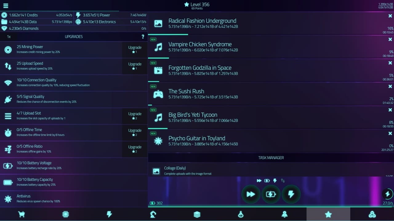 Тайтл расширяет возможности своего предшественника новыми системами, предлагая больше возможностей для выбора и большее число геймеров. Вы будете постоянно улучшать свое оборудование, увеличивая кредитный доход, скорость загрузки и вычислительную мощность. Эти улучшения позволяют быстрее и эффективнее проходить каждый этап. Разгон с помощью мощных генераторов - один из способов выйти за стандартные пределы, давая вам преимущество в усложняющемся мире Upload Simulator Silicon.