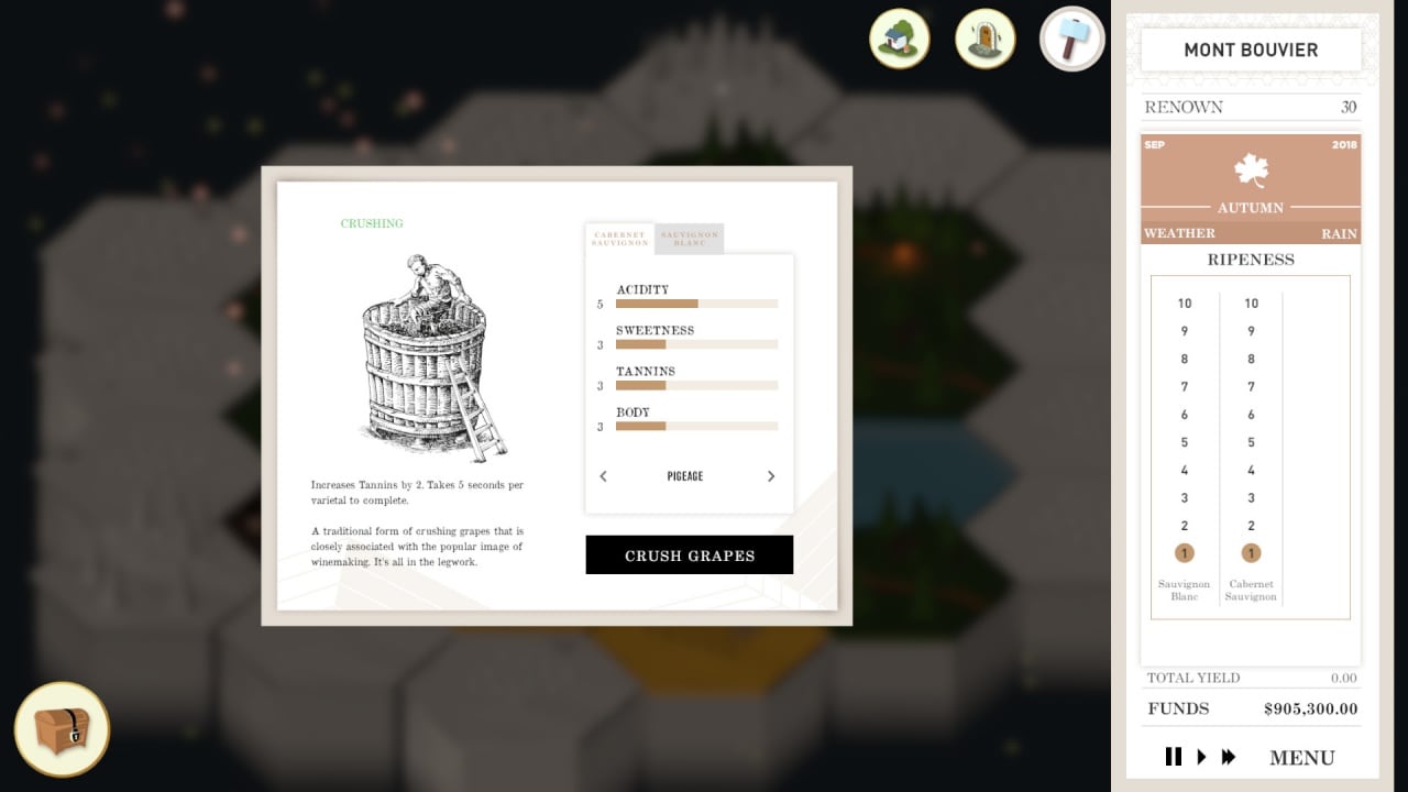 Terroir v 2.4.2 Новая версия Полная версия Последняя Дата выхода 20 сен. 2017 Разработчик General Interactive Co. Жанр Симуляторы, Стратегии, Инди В основном положительные на основе 340 обзоров в Steam 73% Обновлено 24 марта 2025, 21:29 Список изменений Terroir предлагает перенестись в мир экономических отношений и заняться виноделием. Пользователь берёт под своё управление предпринимателя. Он хочет создать собственный бизнес. Прохождение начинается с того, что в его распоряжении имеются только небольшая территория с лесистой местностью и небольшое поместье. Для развития собственного дела и получения дальнейшей прибыли необходимо разработать стратегический план, в котором учитываются подсчёт затрат и расходов. Эти факторы являются основополагающими во всей игре. Без их учёта стать успешным производителем вина не получится.Отличительные функциональные возможности Terroir: можно выбирать множество разных сортов винограда. У каждого свои особенности; присутствует динамичная смена погодных условий. Она полностью отображает реалистичность климата в реальном мире; вино создаётся с помощью 4 последовательных процессов. Это дробление, ферментация, прессование, выдержка; за каждым сортом винограда необходимо ухаживать отдельным образом; можно выпускать различные сорта вина; вначале главный герой для посадки использует 1 участок. Постепенно их количество увеличивается до 33; поместье можно украшать разнообразными предметами и произведениями искусства. Протагонисту сначала нужно приобрести партию саженцев. После этого за ними нужно тщательно ухаживать. Виноград требует посадки, поливки, ухода за ним. Лишние листья растения необходимо подрезать. Чтобы виноград не оказался испорченным вредителями, его опрыскивают. После созревания кисти плодов отправляются на отжим. Готовое вино отправляется на продажу в магазины. А бизнесмен получает долгожданную прибыль. Скачать торрент Скриншоты Показать больше Видео из игры Скачать Terroir Тип релиза Лицензия (Таблетка: Не требуется) Версия v 2.4.2 (Полная) Последняя Размер 223 МБ Интерфейс Английский Озвучка Отсутствует Скачать .torrent торрент файл Скачать БЕЗ торрента прямая ссылка через uTorria Альтернативные раздачи Прямые ссылки GOG версия (Без DRM) v 1.0 527 МБ Показать Системные требования ОС: 7, 8, 10 Процессор: Intel Core2 Duo 2.4 GHz / AMD 3 GHz или лучше Оперативная память: 2 ГБ Видеокарта: Minimum 2 ГБ видеопамяти Место на диске: 2 ГБ Симулятор фермы, Сельское хозяйство, Менеджмент, Расслабляющая, Экономика, Атмосферная, Природа, Градостроение, Управление ресурсами, Строительство базы, Строительство, Тайм-менеджмент, Изометрия