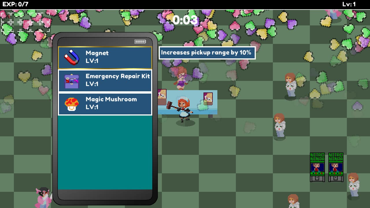 В тайтле семь различных персонажей, каждый из которых имеет свое уникальное стартовое оружие, что делает каждое прохождение неповторимым. По мере продвижения геймеры могут разблокировать до 13 видов оружия и 10 аксессуаров, которые улучшают способности персонажа. Эти предметы появляются случайным образом, придавая каждому прохождению непредсказуемость и реиграбельность. Структура побуждает юзеров приспосабливаться к случайной природе апгрейдов и экспериментировать с различными стратегиями.