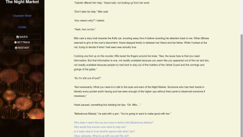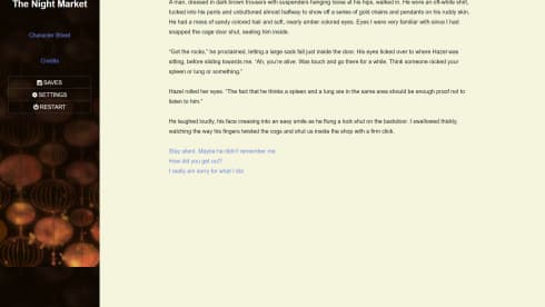 По мере того как вы будете ориентироваться в этом сложном мире, ваш выбор будет иметь значение. От того, с кем вы подружитесь, кому доверитесь и в кого решите влюбиться, будет зависеть ваше путешествие. Отношения, которые вы построите или разрушите, могут кардинально изменить ход вашей истории. Тут есть несколько типов персонажей - мужской, женский или небинарный - вы можете настроить не только внешность, но и характер, что позволит вам получить более индивидуальный опыт. Продвижение по сюжету во многом зависит от ваших разговоров, решений и людей, с которыми вы общаетесь по пути. The Night Market также ставит перед игроками моральные дилеммы. Повествование меняется в зависимости от сделанного вами выбора, а новые области открываются в зависимости от выбранного вами пути.
