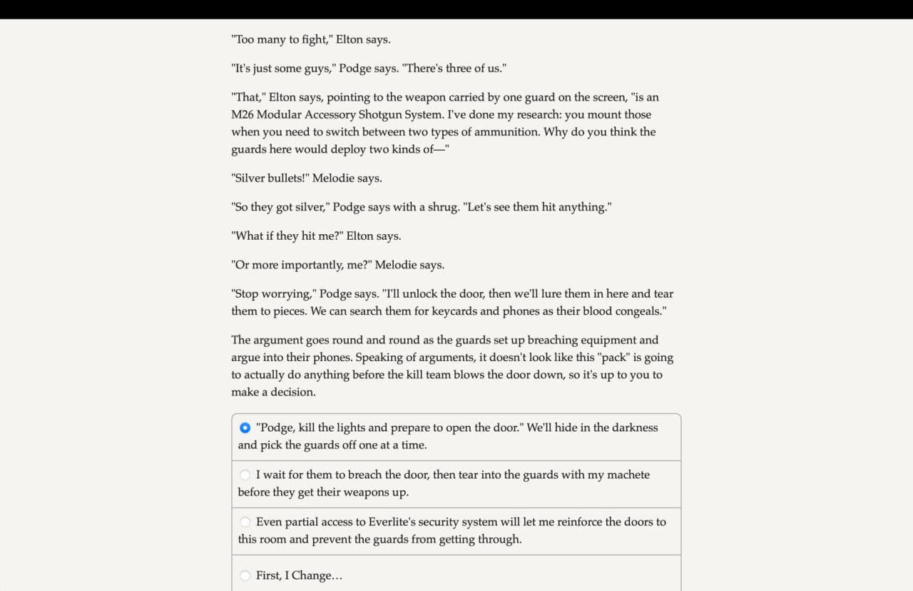 Тайтл исследует темы предательства, обмана и последствий бесконтрольной Ярости. Она посвящена внутренней борьбе вервольфов, которые пытаются справиться с последствиями своих прошлых действий и восстановить свои силы. Благодаря насыщенному повествованию и множеству разветвленных путей юзеры попадают в глубокий, захватывающий сеттинг, где выбор играет центральную роль в разворачивающейся драме. Каждое принятое решение может либо приблизить игромана к искуплению, либо еще больше погрузить во тьму.