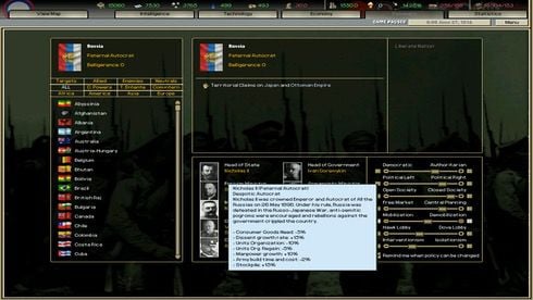 Для игрока встанут две основные проблемы в обществе и государстве. Первая — это политика. Внешняя и внутренняя разведка — основные направления ведения политических действий. В зависимости от периода, игрок будет узнавать основные исторические события, однако ход всей истории можно повернуть в другую сторону. Второе — промышленные улучшения и задачи для производства. Например, зная про Вторую Мировую Войну, вы можете начать заранее готовить солдат и начать гонку вооружений, но, если об этом узнает Германская империя, то люди в ней не пойдут воевать против вас — потому что физически они не будут готовы.