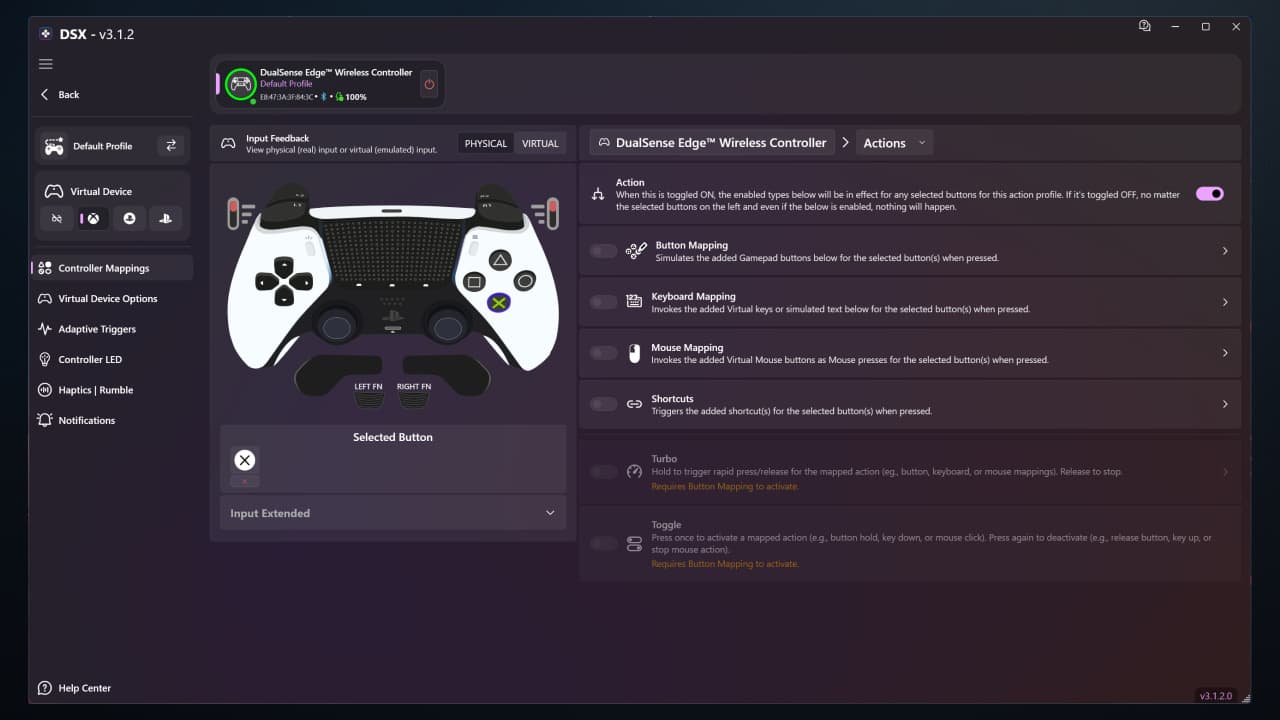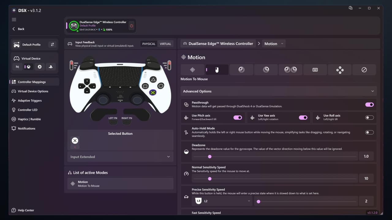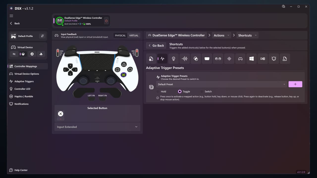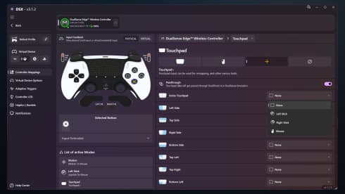 Предусмотрен выбор типов виртуальных устройств, таких как Xbox 360 или применение эмуляции DualSense. Функционал тестирования ввода также интегрирован в интерфейс приложения. Дальнейшая кастомизация охватывает варианты тактильной отдачи, преобразующие системный звук, данные вибрации, нажатия кнопок, движения триггеров или ввод с джойстиков в отклики. Программное обеспечение открывает доступ к официальным режимам адаптивных триггеров, встречающимся в тайтлах с нативной поддержкой на ПК, наряду с устаревшими вариантами.