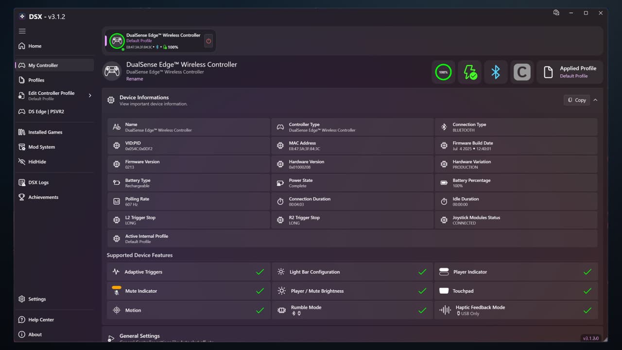 Доступно несколько типов эмуляции, включая опции для представления как Xbox360 и DualShock 4. Перечень совместимых девайсов включает Wireless, а также обе версии (v1 и v2) DualShock 4 Wireless Controller; частичная совместимость распространяется на беспроводной USB-адаптер, контроллеры PS VR 2 Sense и Access Controller. DSX предоставляет средства для настройки различных аспектов работы манипулятора через систему профилей.