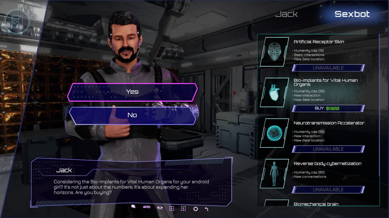 В Cybersex: Lust Story все строится на разговорах и решениях, которые влияют на эволюцию андроида. Игрок организует встречи и выбирает улучшения — импланты, открывающие ей ощущения вроде вкуса или прикосновений. Каждая беседа помогает ей лучше разбираться в эмоциях, стирая грань между запрограммированным поведением и чем-то живым. Тайтл включает сцены наготы и взрослые темы, вплетенные в сюжет, пока андроид изучает физические и душевные пределы вместе с геймером.